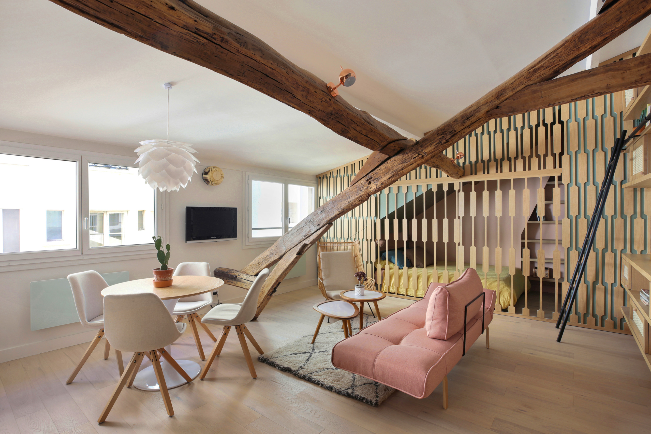 La pièce à vivre est unique en son genre; le rachat des combles pour agrandir le volume de l’appartement implique la traversée de la charpente d’origine, massive et aérienne à la fois.