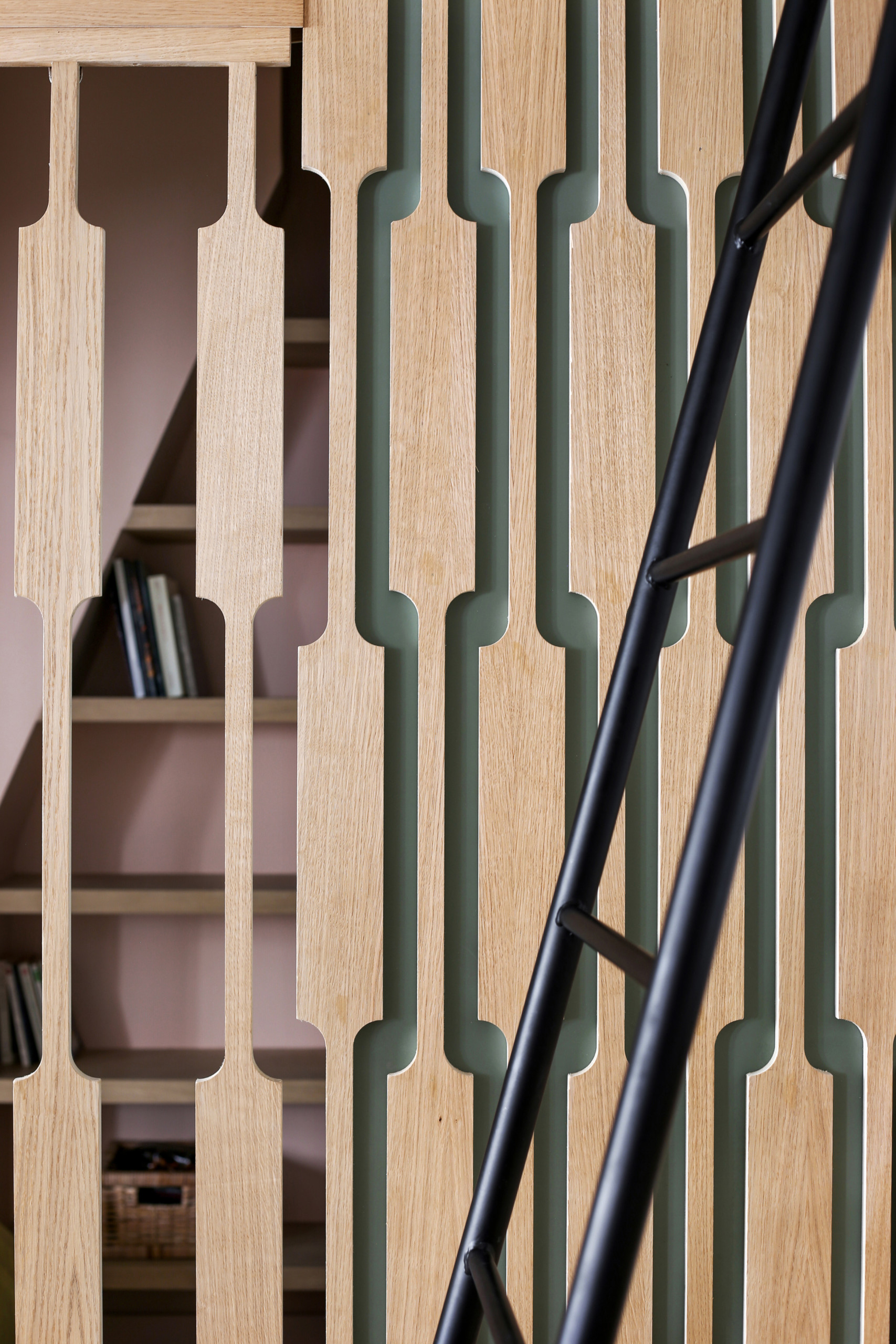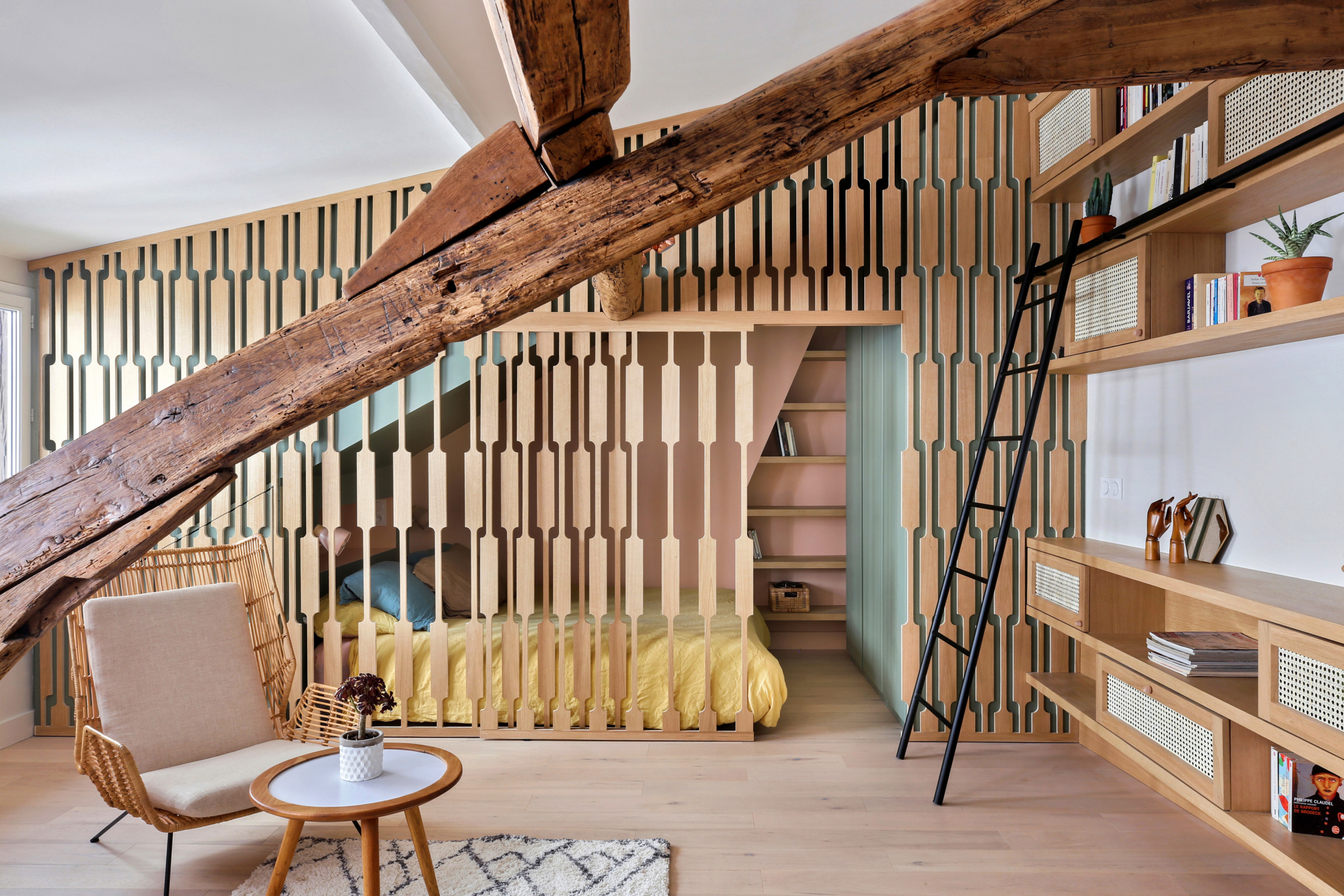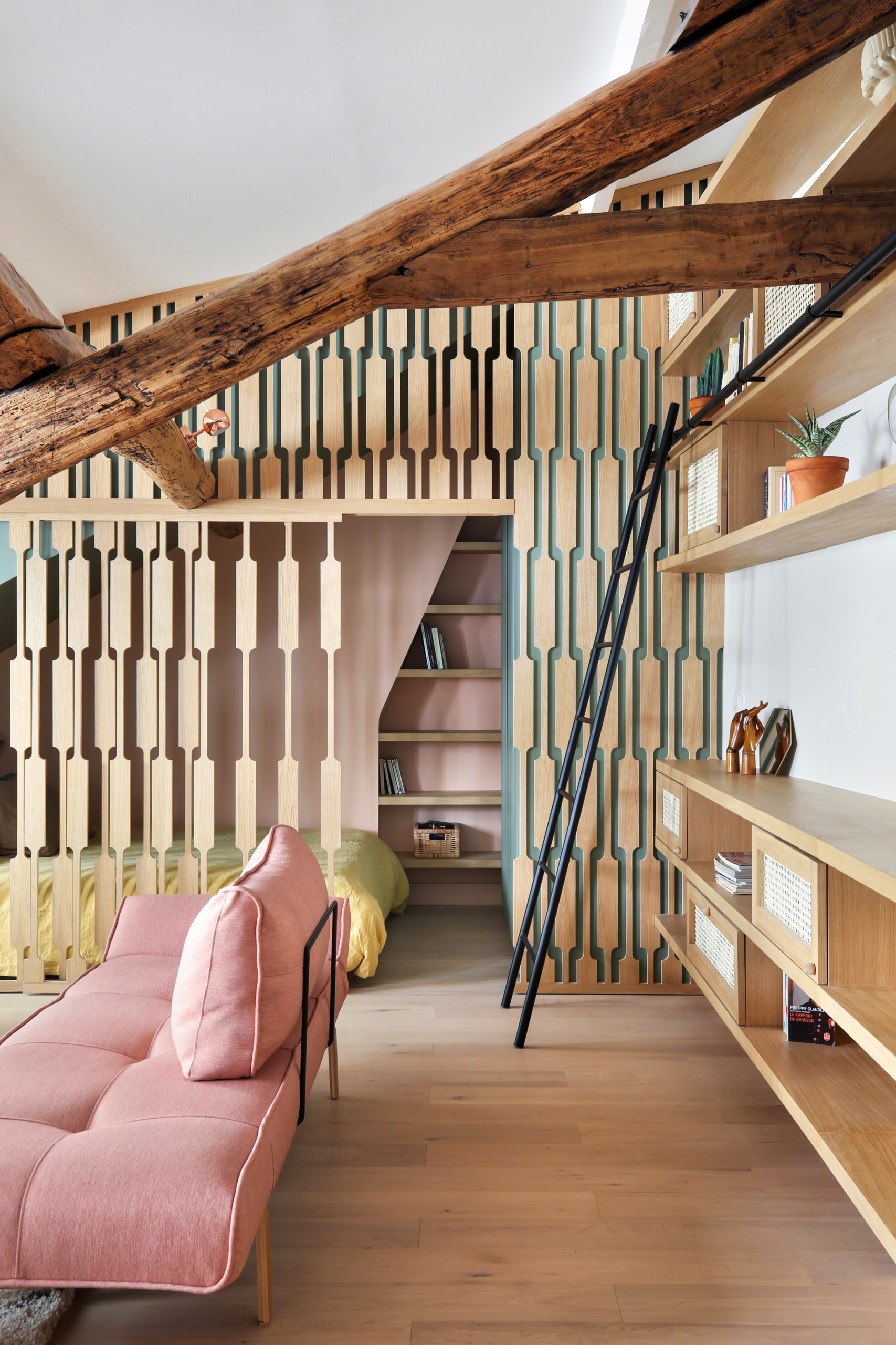 Bibliothèque Bois Carrelage Claustra Mur coloré Sous les toits Verre cathédrale Verrière