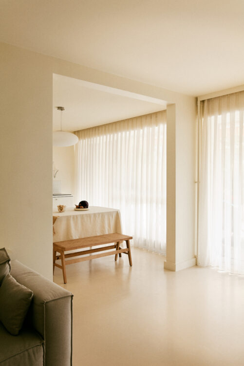 Pour renforcer la douceur et la luminosité de la grande pièce, des voilages crème sur mesure ont été installés. Simple et économique, cet ajout permet d’instaurer immédiatement une atmosphère chaleureuse et apaisante, tout en modulant la lumière naturelle selon les besoins des occupants.