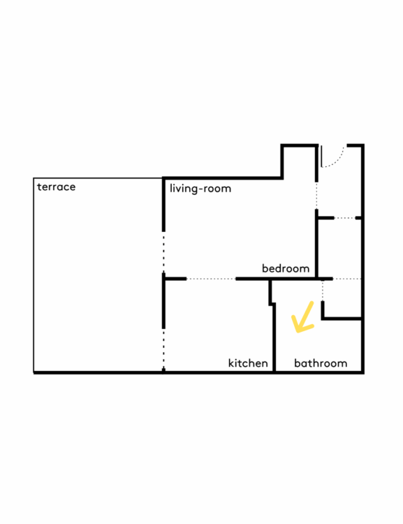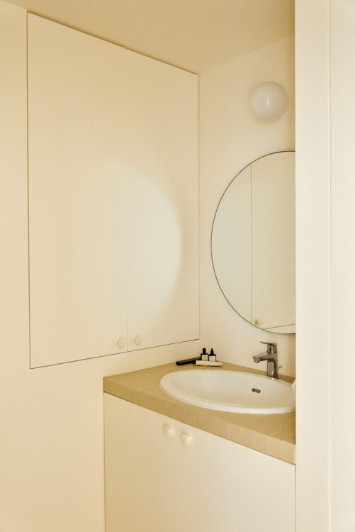 Entièrement repensée, la salle d’eau mise sur la fonctionnalité sans renoncer à la douceur chromatique qui caractérise l’appartement. Une série de rangements intégrés optimise chaque recoin et dissimule même un espace buanderie. Les tons beige et crème assurent une continuité apaisante, tandis que les poignées, peintes dans la même teinte que les portes, s’effacent presque entièrement. Exit les lignes strictes : l’espace adopte une géométrie plus enveloppante, portée par une applique boule, un miroir rond et une vasque ovale.
