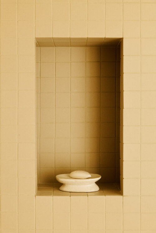 Mais la rigueur reste bien présente. Dans la douche, une niche rectangulaire s’aligne parfaitement sur le calepinage du carrelage beige soutenu, soulignant la précision du dessin… jusque dans la pièce d’eau !