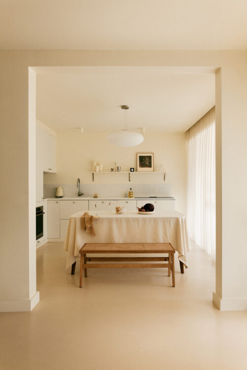Une grande ouverture ménagée dans le mur relie le séjour à la cuisine, créant un dialogue fluide entre les deux espaces. Le sol continu renforce l’effet de volume et de perspective, tandis que l’aménagement soigneusement pensé optimise la fonctionnalité, offrant une cuisine pratique et accueillante.