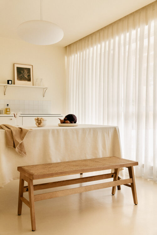 Le banc en bois et la table recouverte d’une nappe prolongent subtilement les voilages crème, renforçant le caractère immaculé et lumineux de l’espace tout en apportant confort et convivialité.