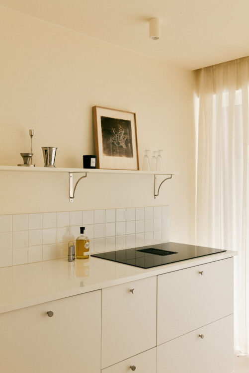 La cuisine adopte un aménagement sobre et fonctionnel, où chaque détail participe à la clarté de l’espace. La crédence en carreaux de faïence blanche reflète la lumière, tandis que le plan de travail et les portes de placards unifiés dans des tons crème et beige créent une douce harmonie. Les poignées minimalistes prolongent l’esprit épuré et lumineux de la pièce.