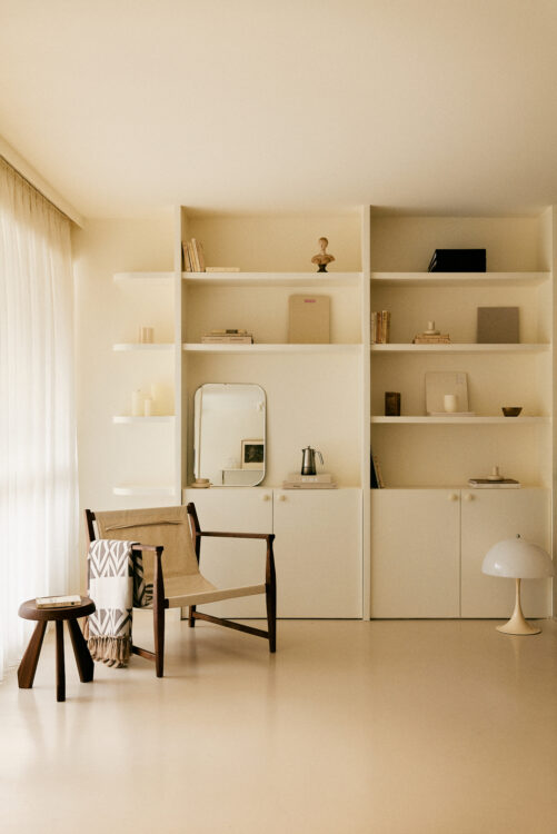 Le parquet existant a été conservé et peint dans un beige soutenu, créant un dialogue avec la bibliothèque sur mesure en médium peint. La pièce de vie accueille également un canapé convertible.