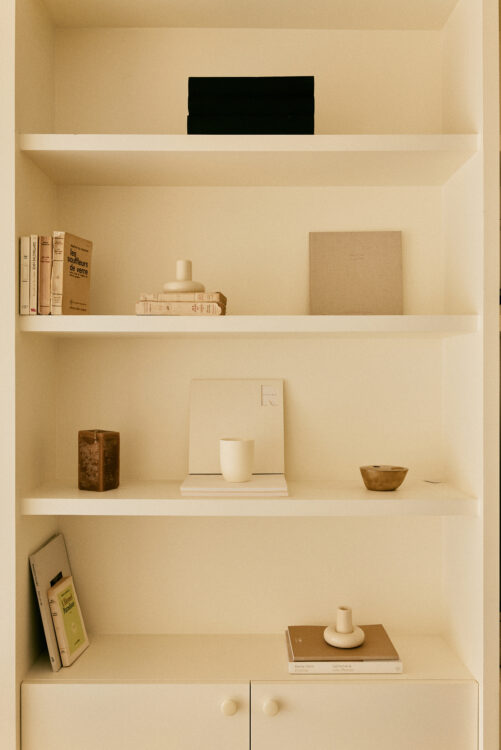Zoom sur la bibliothèque. Les rangements fermés en partie basse offrent discrétion et fonctionnalité, tandis que les étagères supérieures, d’une hauteur régulière, mettent en valeur livres et objets, structurant l’espace avec élégance.