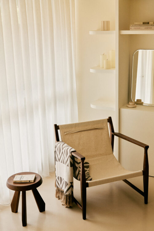 Le bois sombre du fauteuil et de la table basse du salon crée un contraste subtil avec la palette claire du studio et insuffle une touche presque ethnique, offrant un véritable petit refuge dans cet espace baigné de douceur.