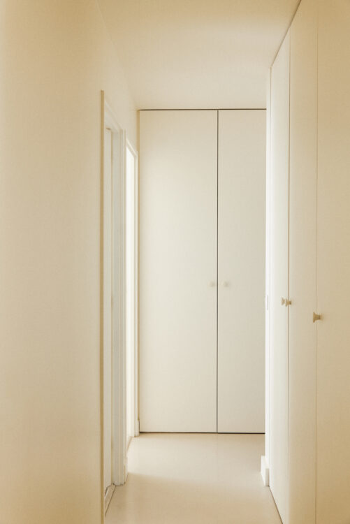 L’appartement ne comptait aucun placard à l’origine. Pour y remédier, une série de rangements intégrés en médium peint a été imaginée. Le couloir en est largement pourvu, gagnant ainsi en fonctionnalité.