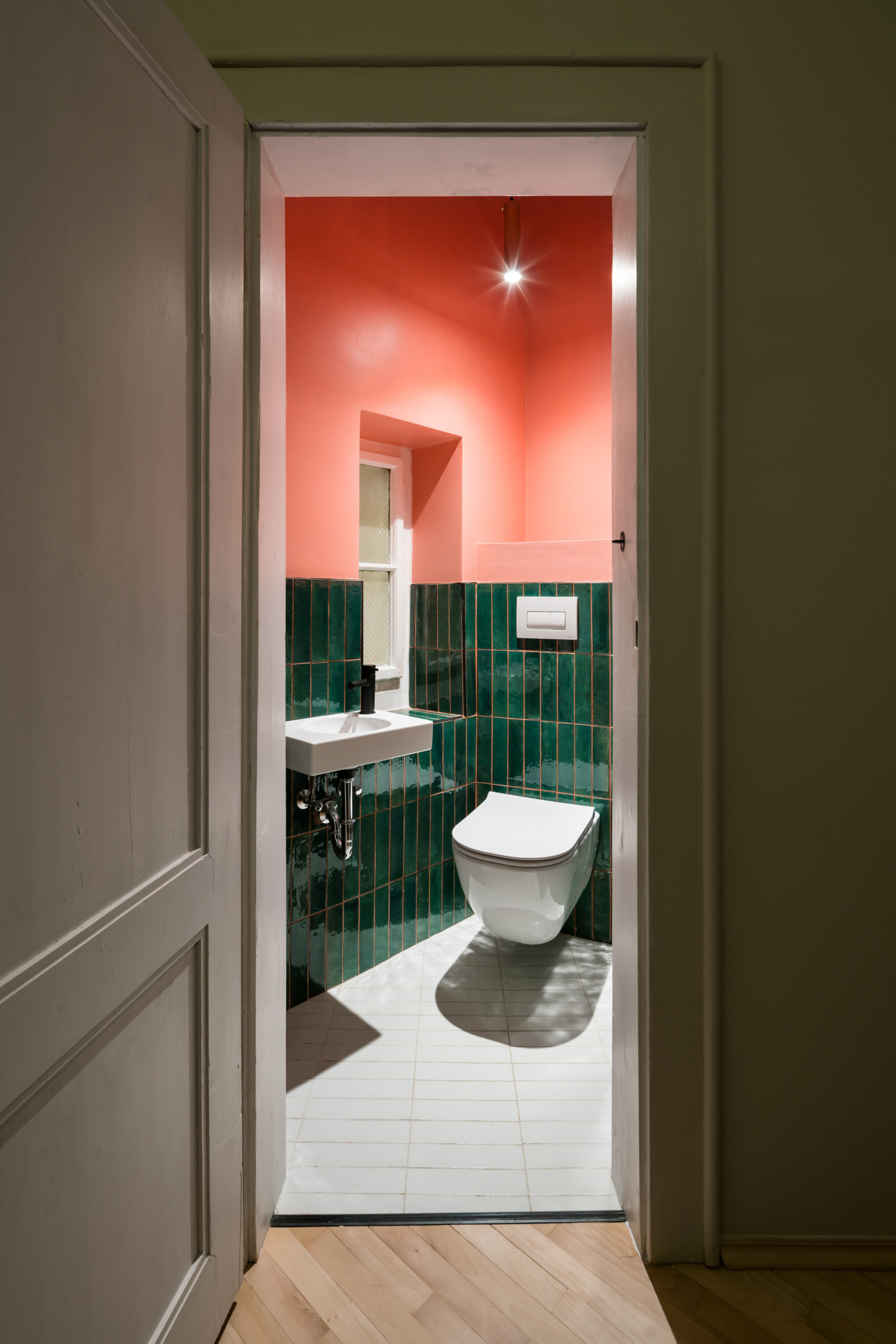C’était sans compter sur les toilettes, pensées comme une pièce à part entière, quasiment déconnectée du reste de la déco avec son carrelage effet zellige vert soutenu et son rouge rosé aux murs !
