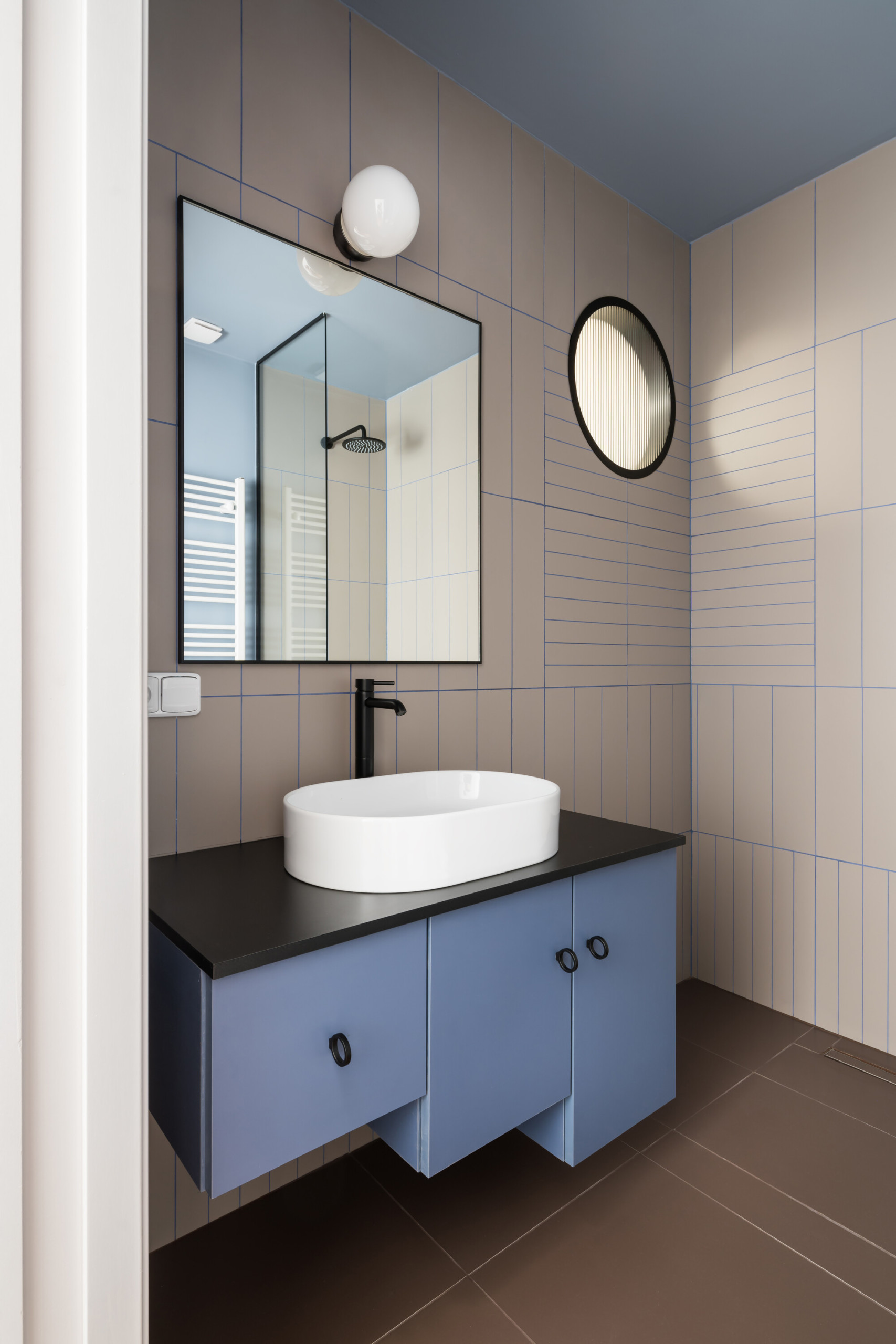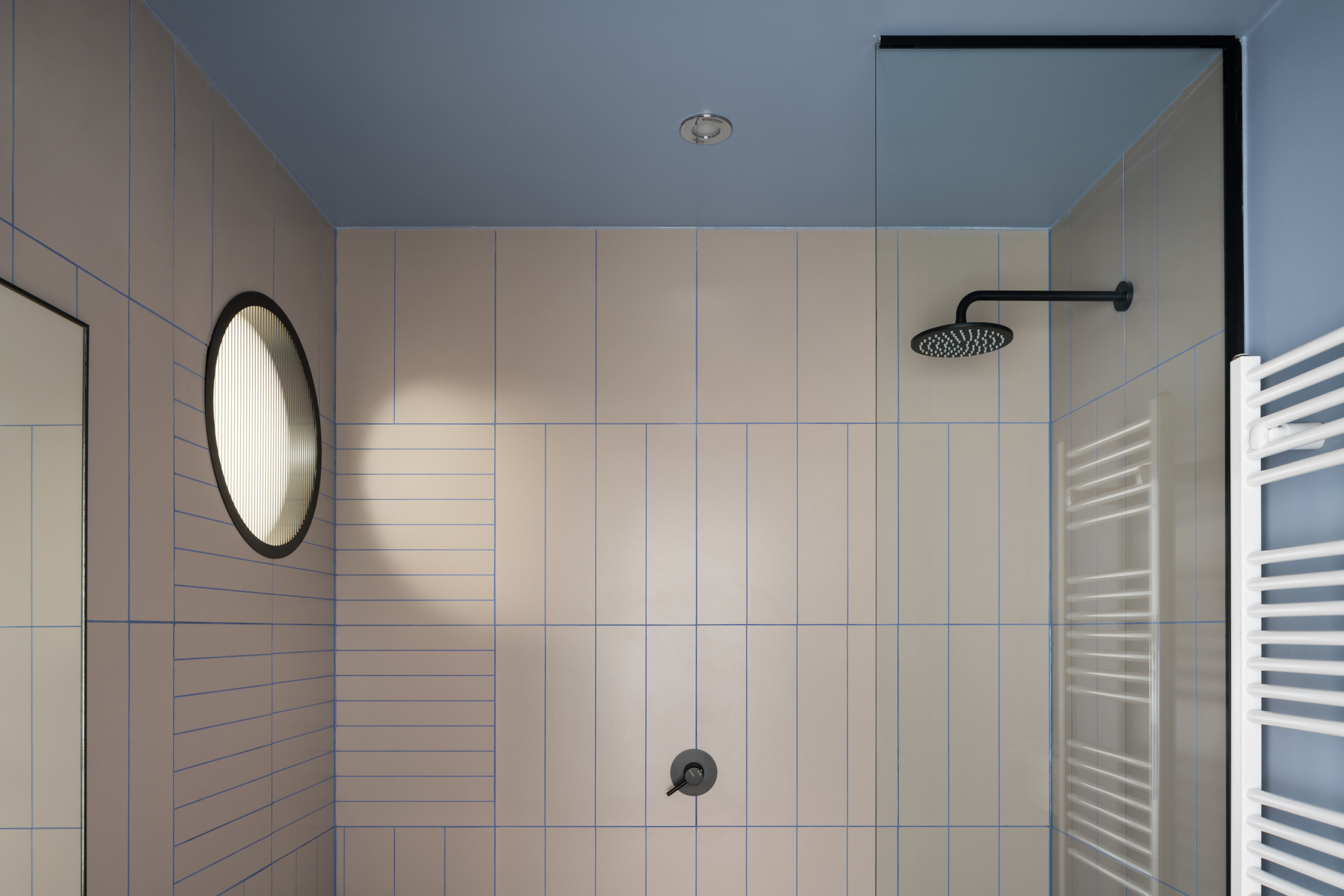 Dans la douche, le bleu layette rehausse l’omniprésence du beige dans l’appartement.