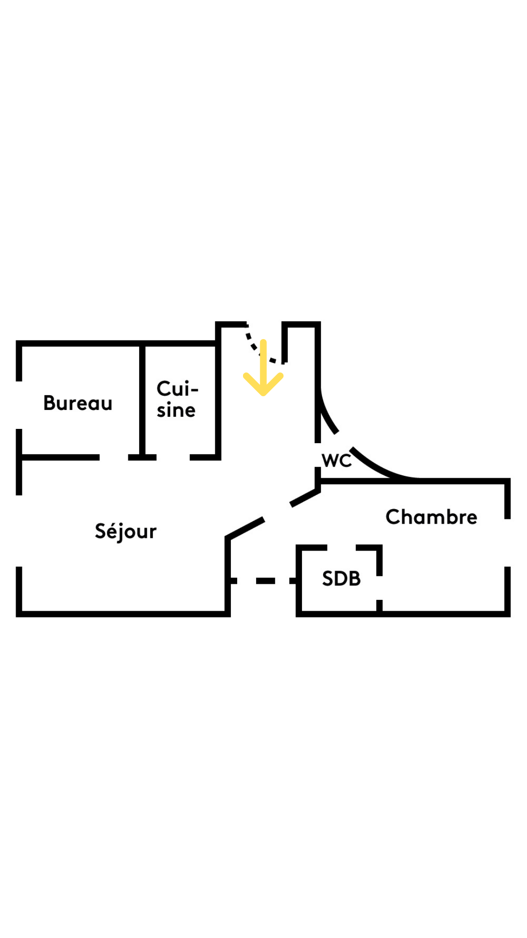 L’appartement nous accueille avec une large entrée. Au fond, une cloison en biais nous invite directement à rejoindre le salon.