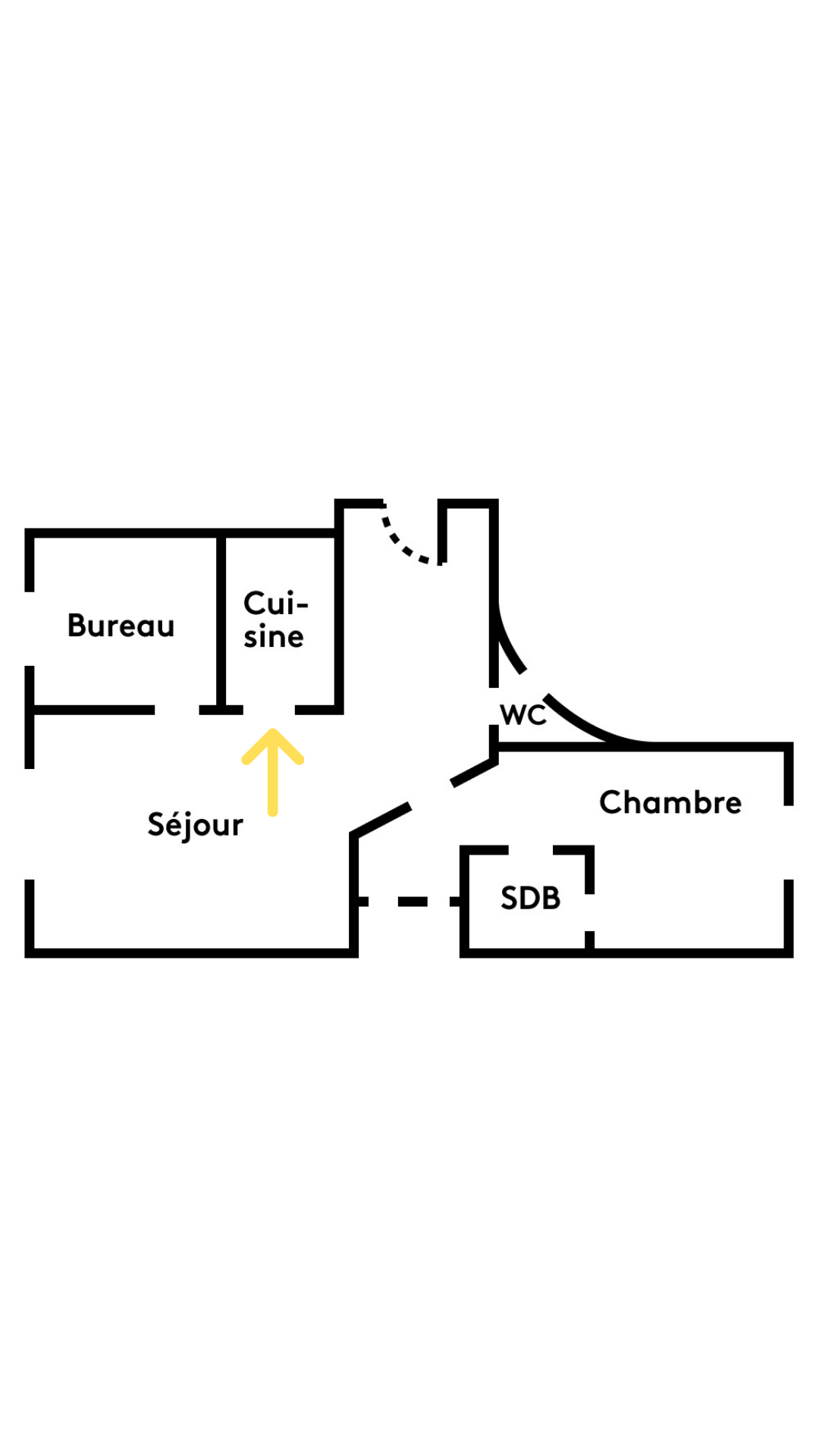 Dans la cuisine, on a poussé le détail jusqu’à concevoir une encoche dans l’encadrement de la porte. Une belle idée pour casser l’aspect couloir vu depuis le salon et créer du dynamisme !
