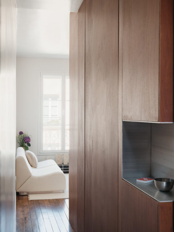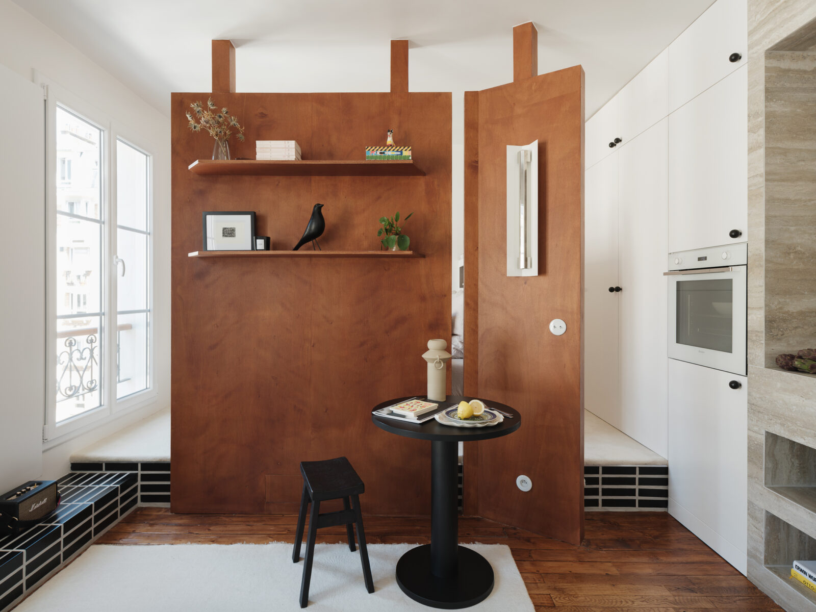 Dans cet appartement de 25 mètres carrés, l’agence Rosso Studio sculpte un nouvel équilibre entre lumière naturelle et parquet d’origine. Retour sur une rénovation radicale, portée par une écriture poétique.