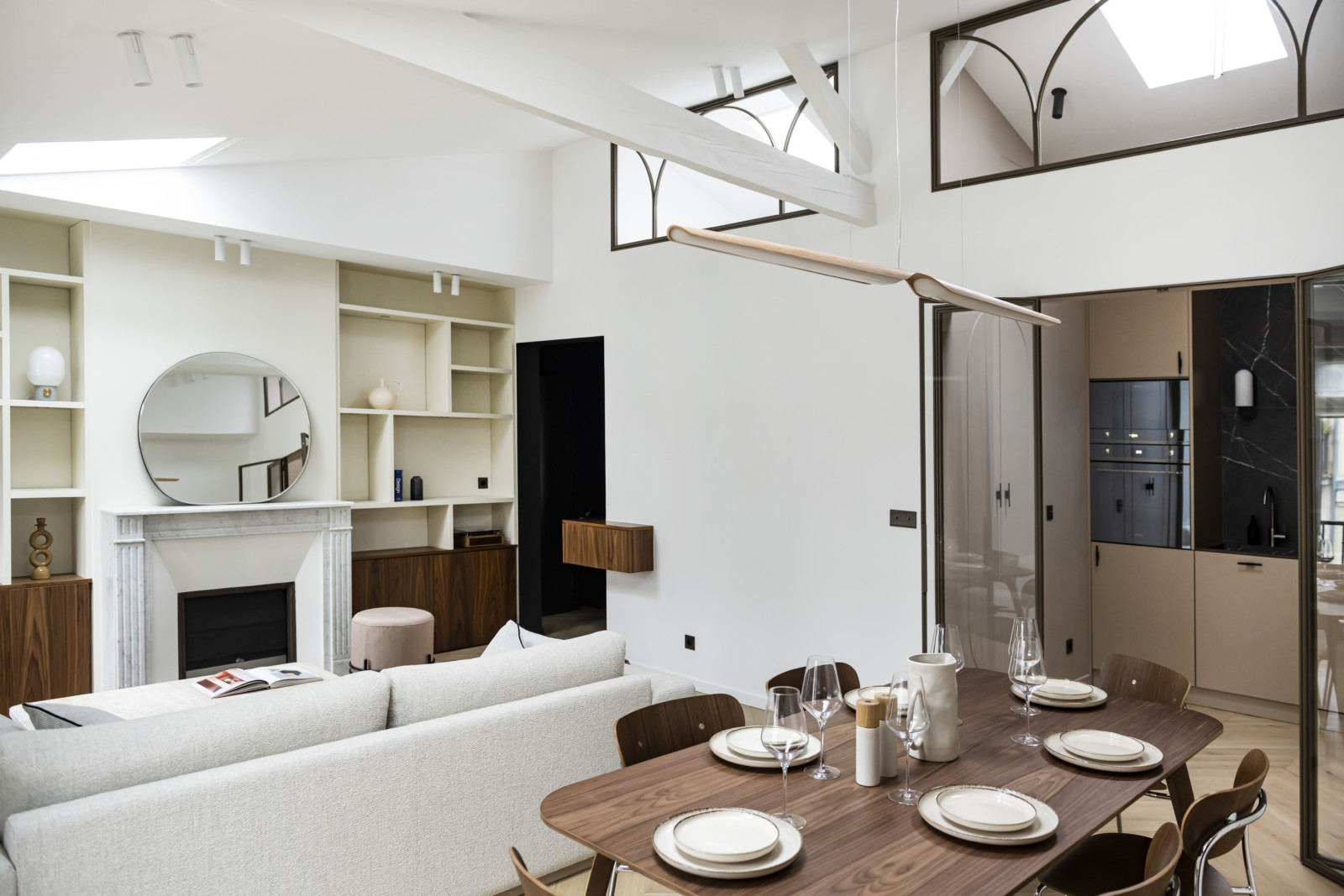 Les combles ont été récupérés pour créer de nombreuses fenêtres de toit et obtenir cette belle hauteur de plafond sous pente.