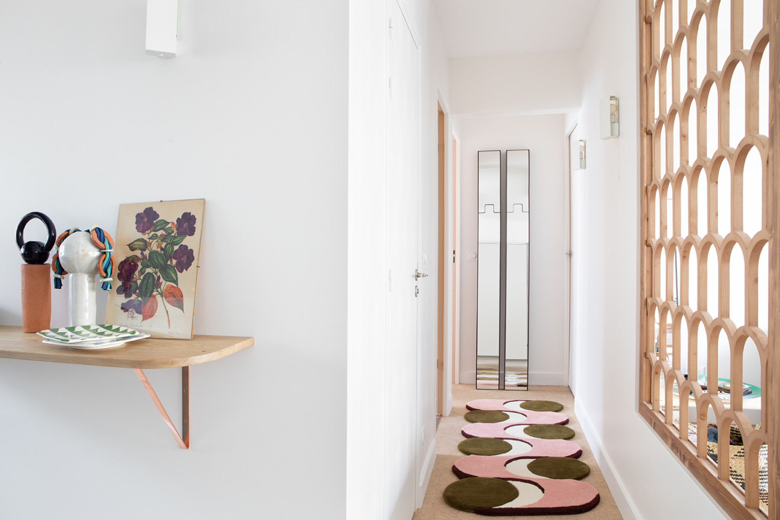 L’entrée a été entièrement décloisonnée pour laisser passer la lumière et accentuer le caractère traversant de l’appartement.