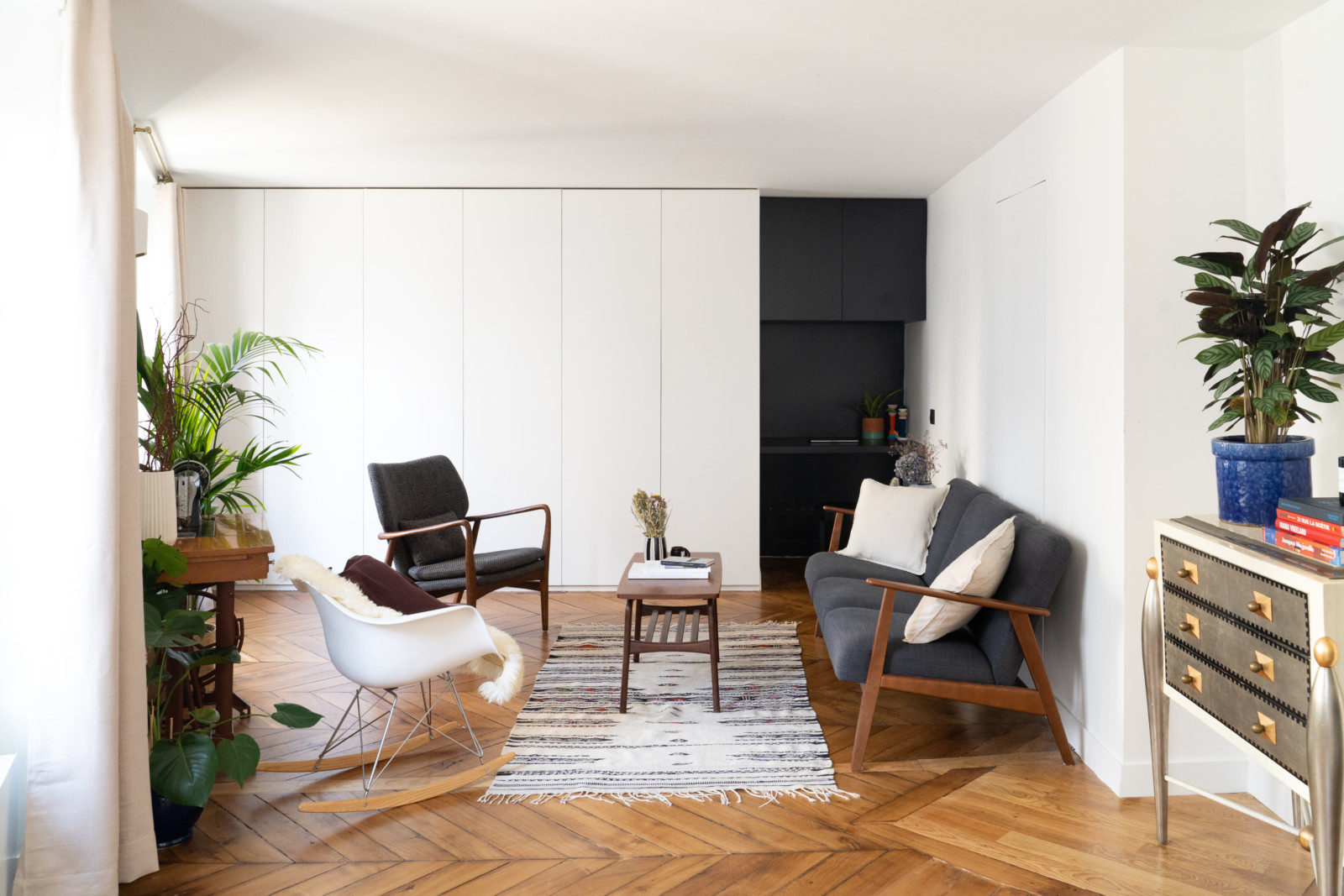 À première vue, l’appartement fleure un certain classicisme haussmannien. Des rangements toute hauteur ont été créés.