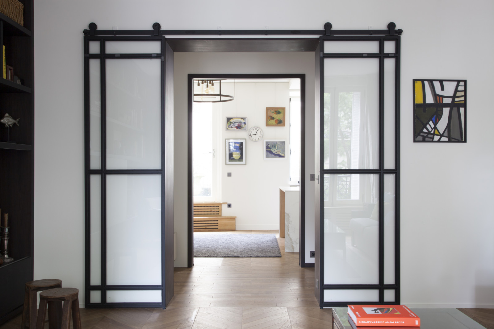 On admire la double porte coulissante fermant le salon, mise en abyme par celle accédant à la cuisine. Un design qui n’est pas sans rappeler Mondrian !