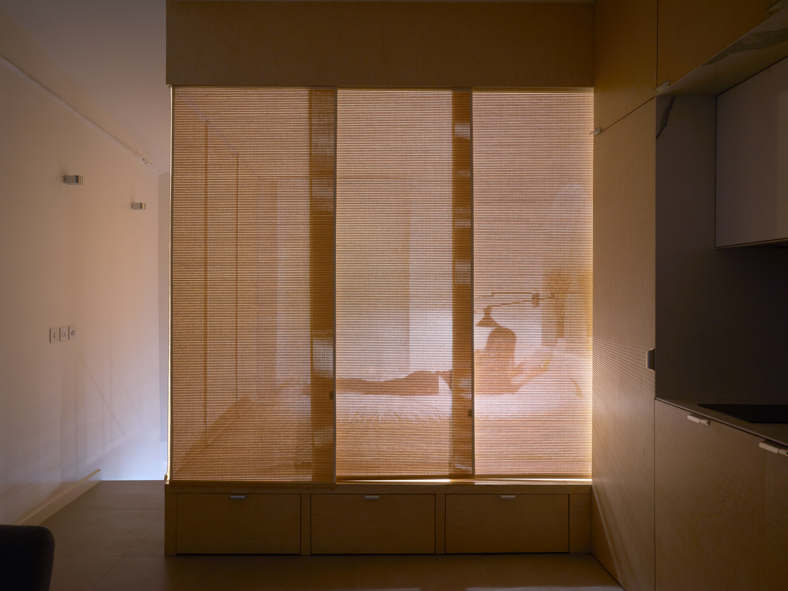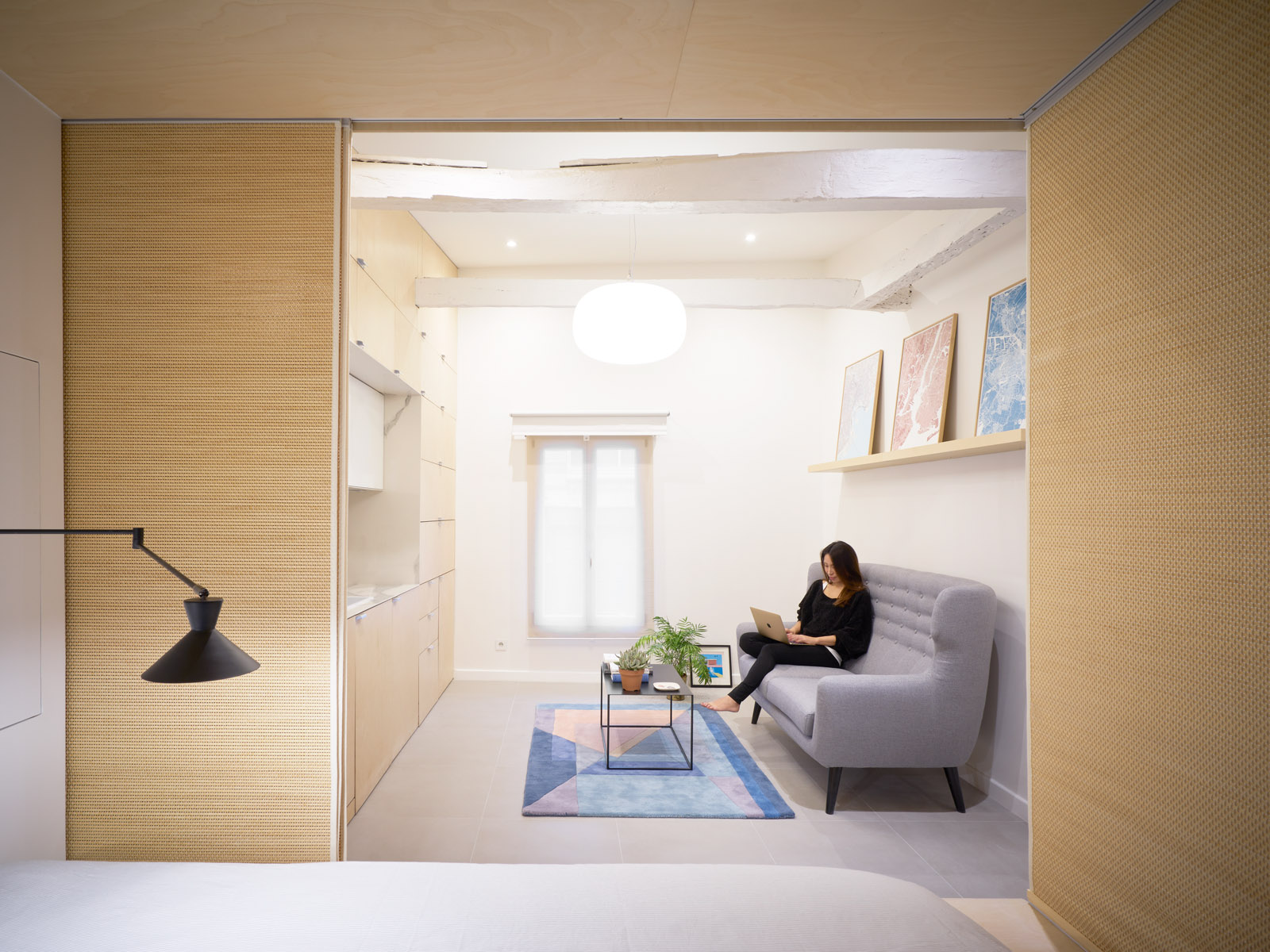 Malgré la petite surface de l’appartement et le souhait de garder un espace de vie le plus vaste possible, il n’était pas question de créer un déséquilibre avec un espace nuit réduit et anecdotique.