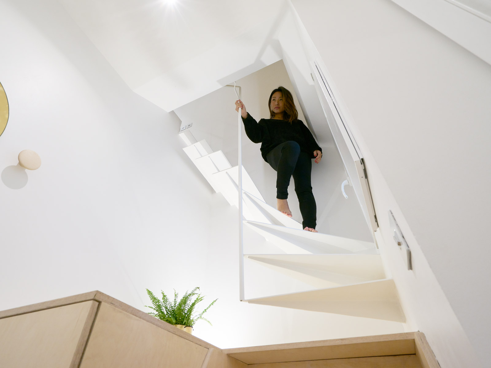 Lorsqu’on descend à l’étage d’entrée, l’escalier métallique, blanc et aérien, se transforme…