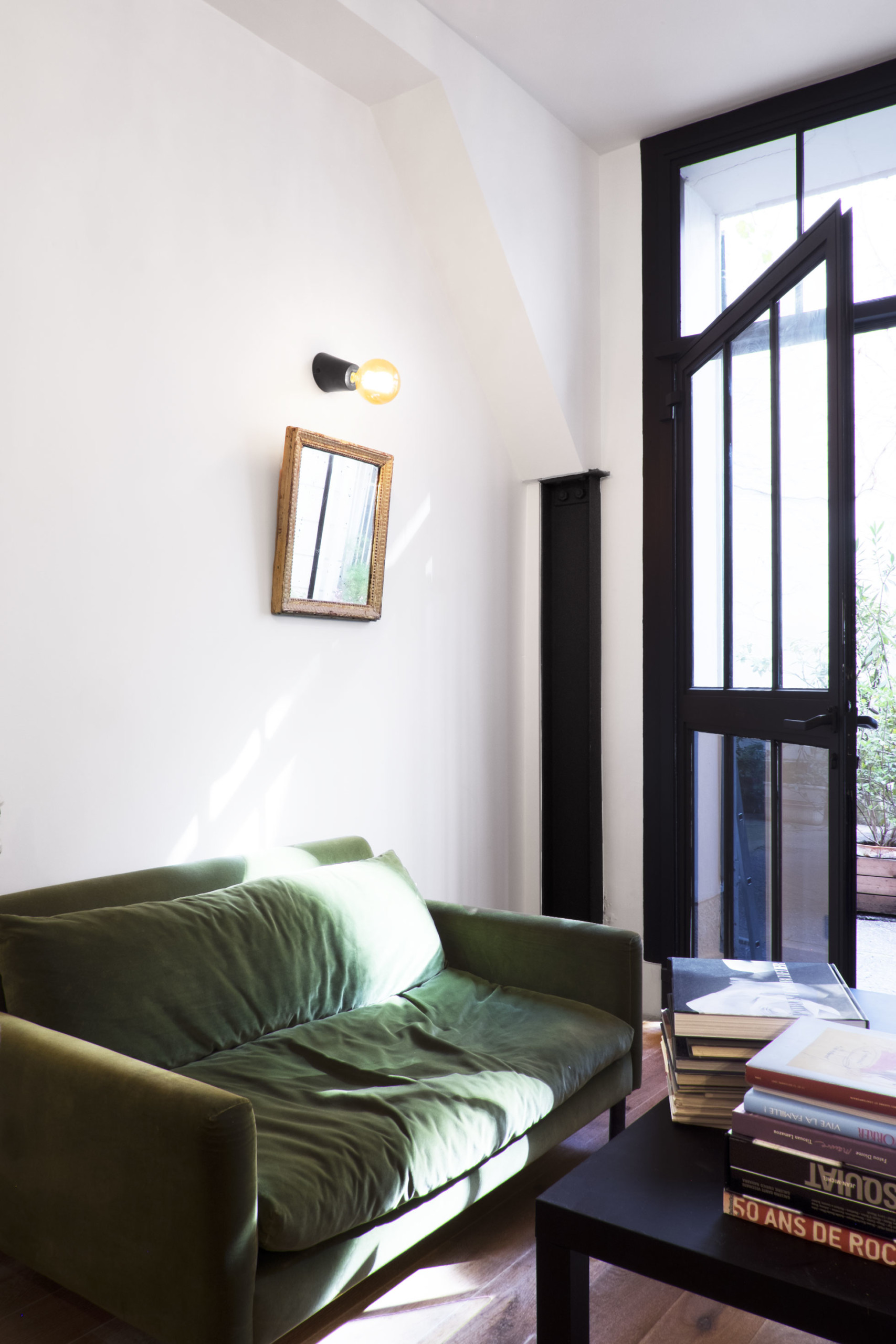 Ici, les meubles ont été chinés avec soin, comme c’est le cas pour ce confortable canapé en velours vert et le miroir doré. L’applique en porcelaine @zangra, avec son ampoule à filament, trouve parfaitement sa place !