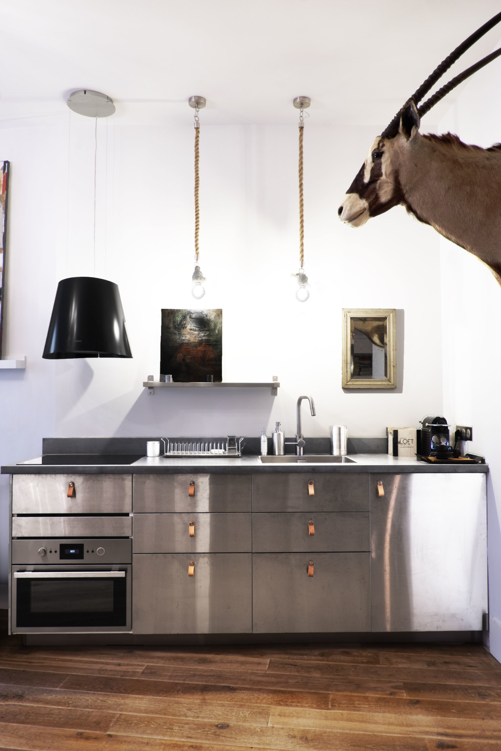 La cuisine, entièrement ouverte, prolonge le séjour. Ses meubles sont en inox et des lanières de cuir font office de poignée tout en apportant une touche chaleureuse à l’ensemble.