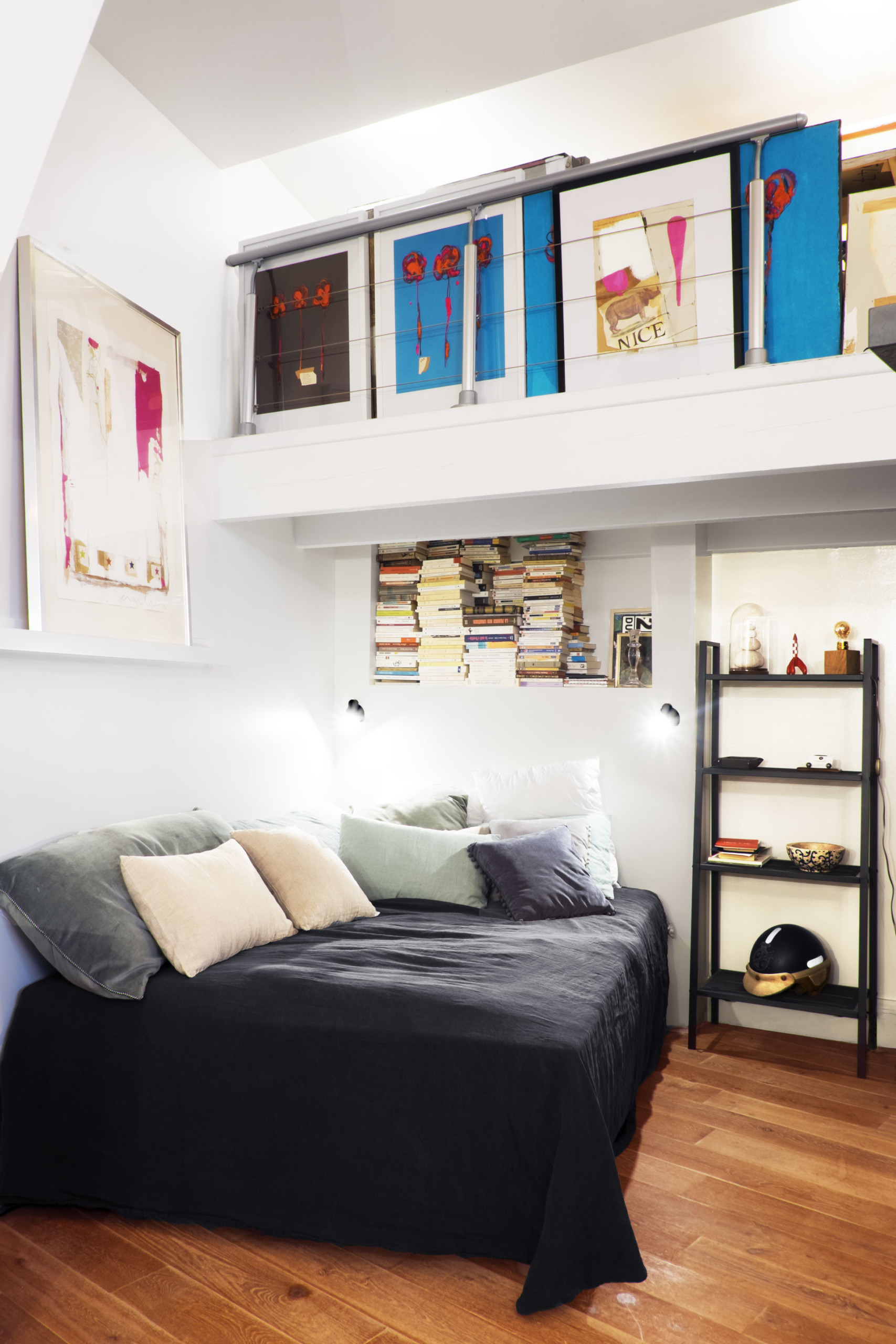 Pas de cloison pour séparer la chambre ; c’est la structure du lieu, avec sa petite mezzanine et l’étagère encastrée, faisant office de bibliothèque et de tête de lit, qui délimitent l’espace.