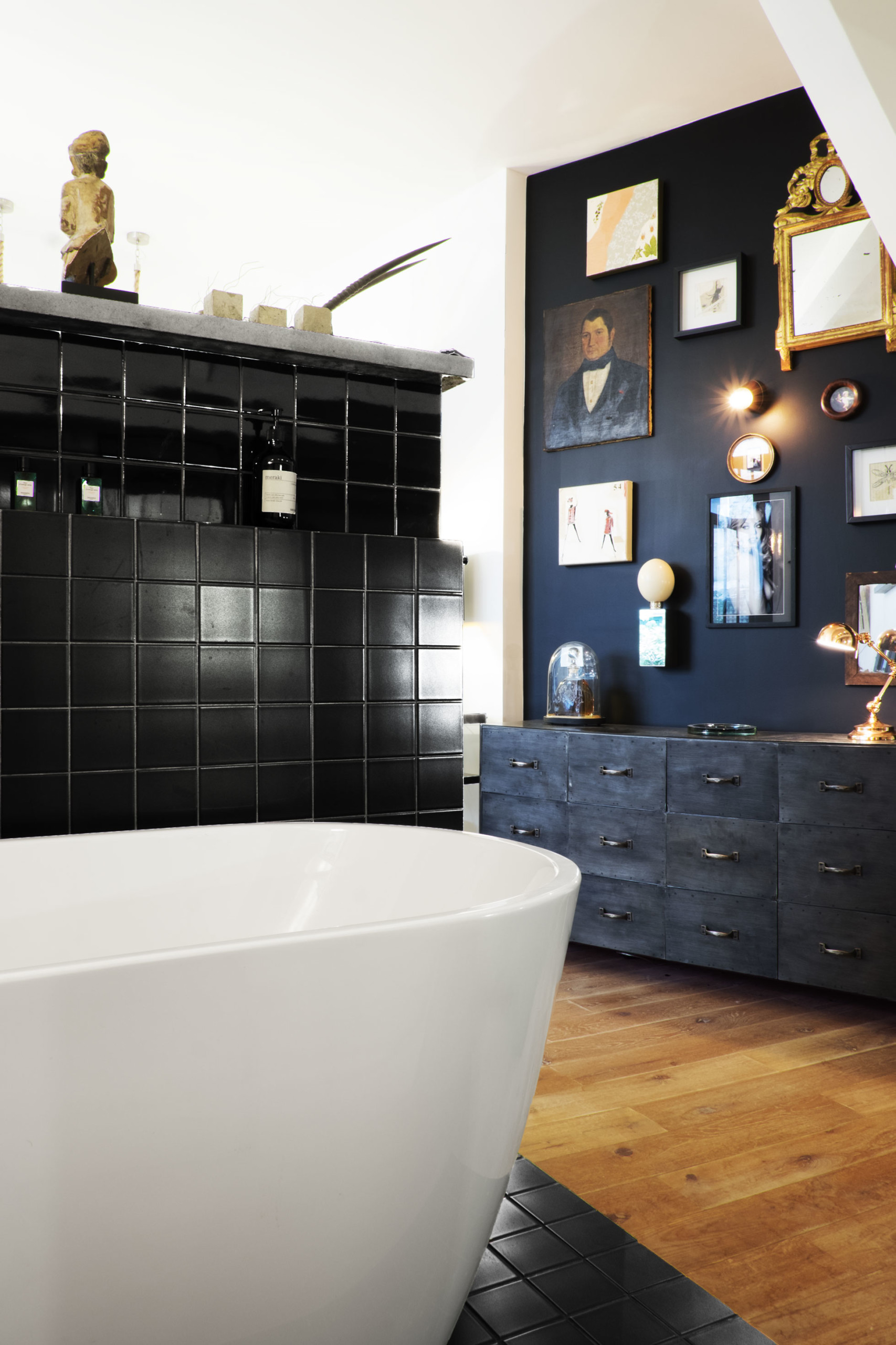 La transition vers la chambre est faite grâce à ce mur peint en noir, et la composition d’objets en tout genre, chinés et soigneusement agencés dans l’esprit du cabinet de curiosité.