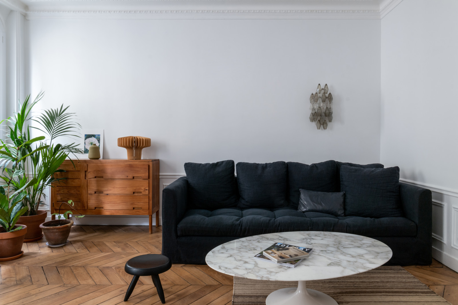 L’ameublement épuré met en valeur les caractéristiques haussmanniennes de l’appartement: parquet massif, moulures, et bien sûr cheminée en marbre !