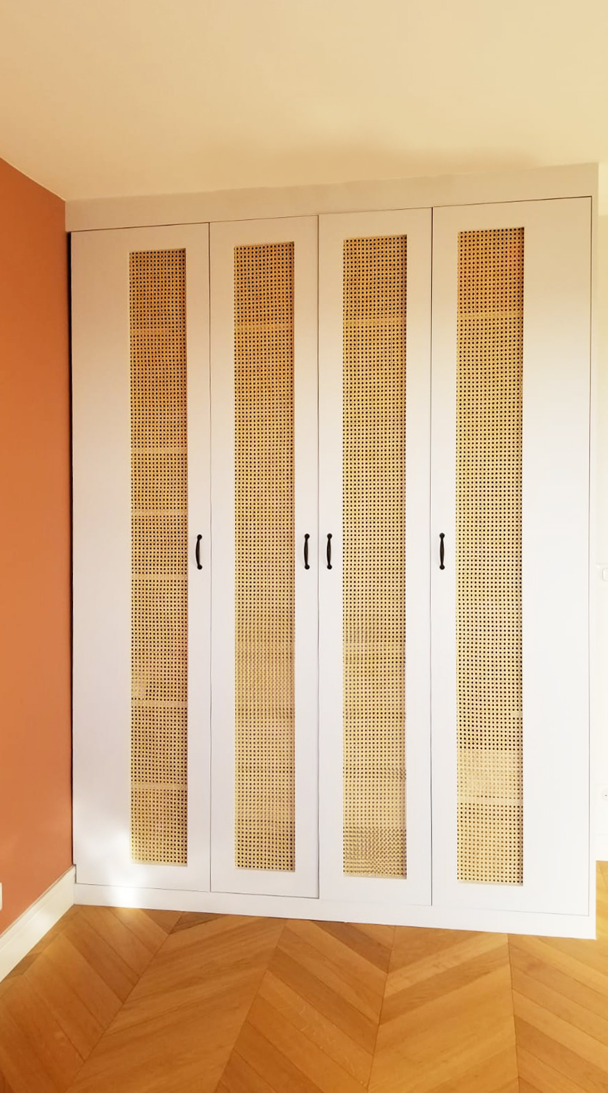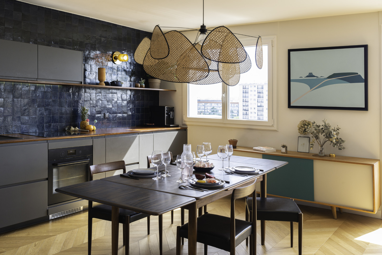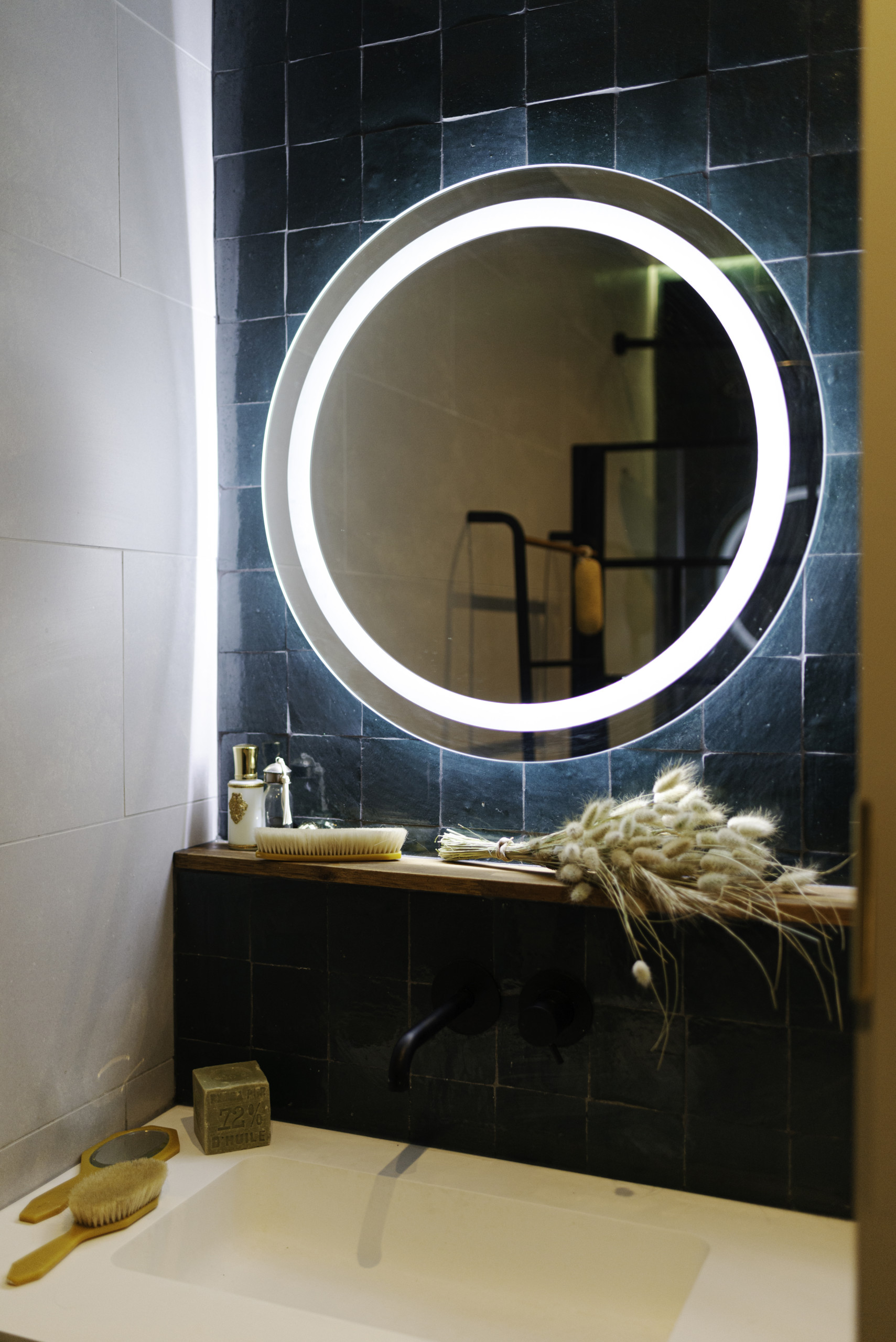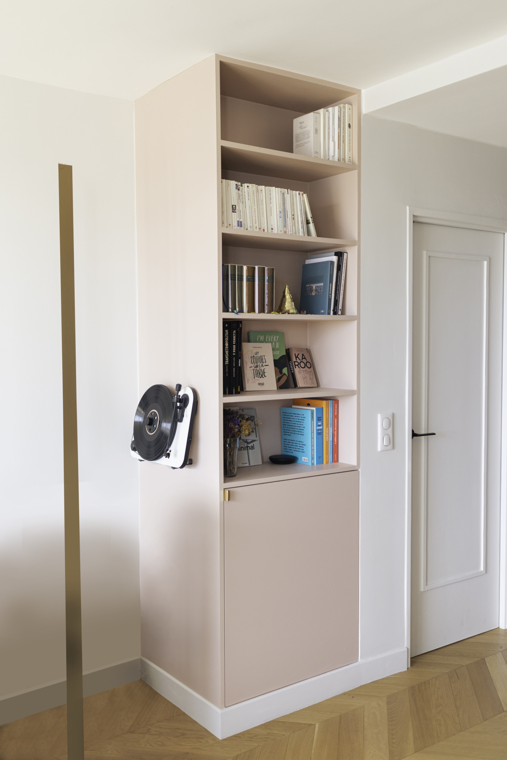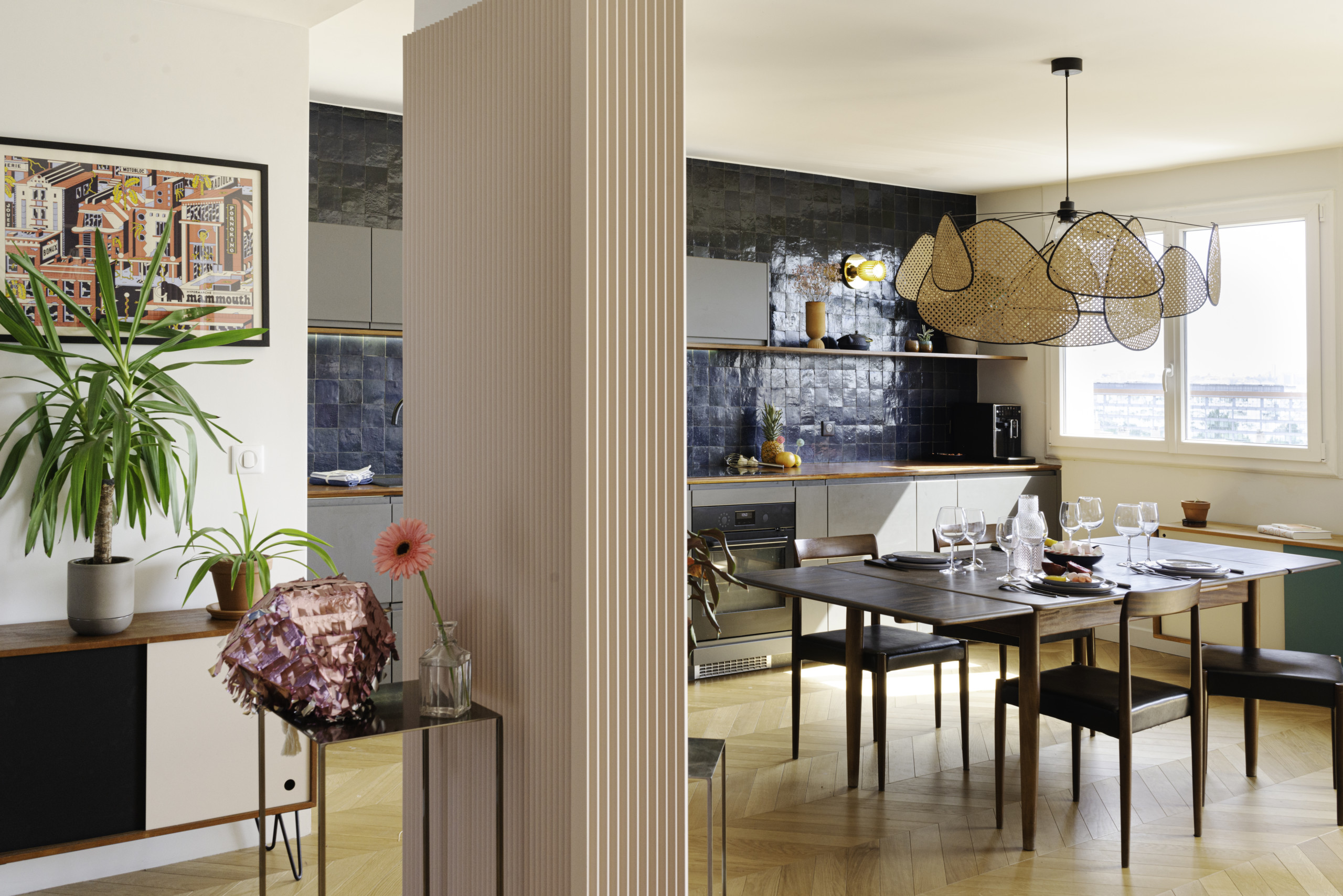 Bibliothèque Bois Cuisine ouverte Miroir Moulure Mur coloré Zellige