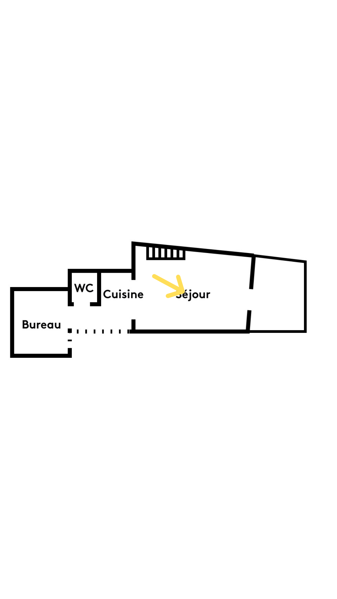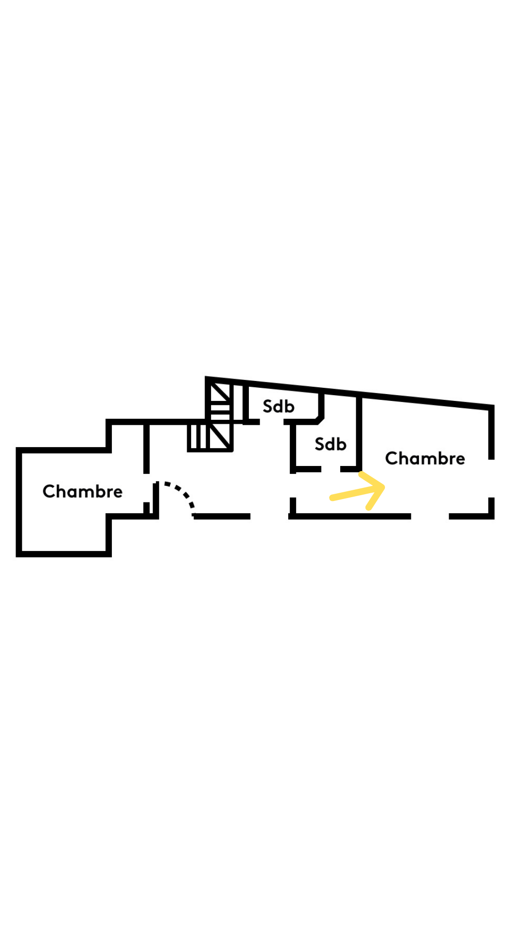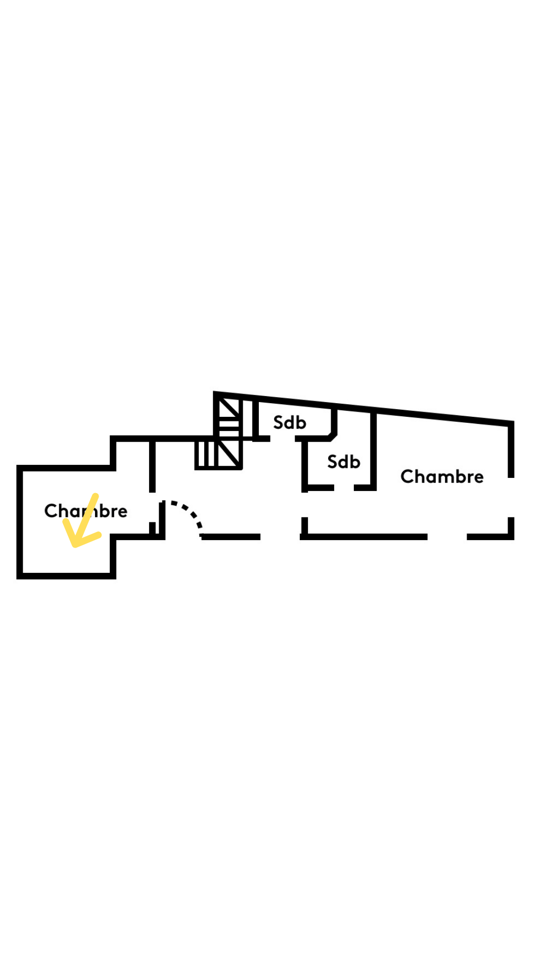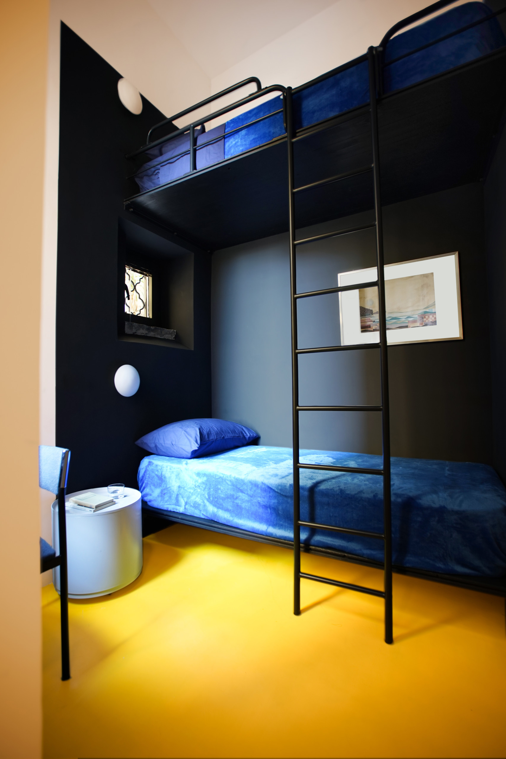 Elle distribue, de part et d’autres, deux chambres. La première est traitée avec un mur noir et un sol jaune qui captent la lumière.
