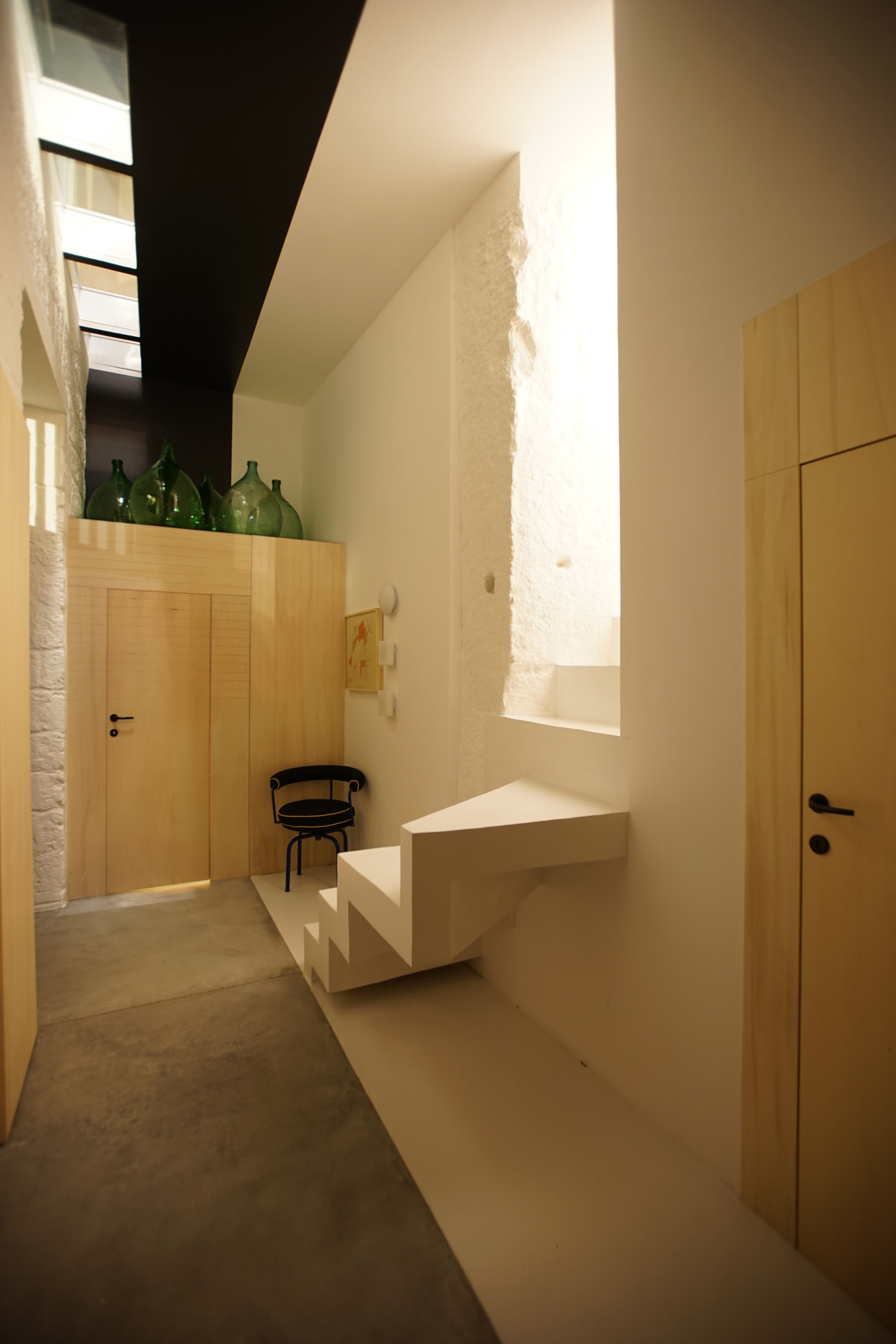 Pour accéder à l’étage, on emprunte un escalier unique en son genre… sa partie supérieure est directement creusée dans la roche ! Quatre marches blanches ont été ajoutées pour le rejoindre ; un mélange d’authenticité et de moderne très réussi.