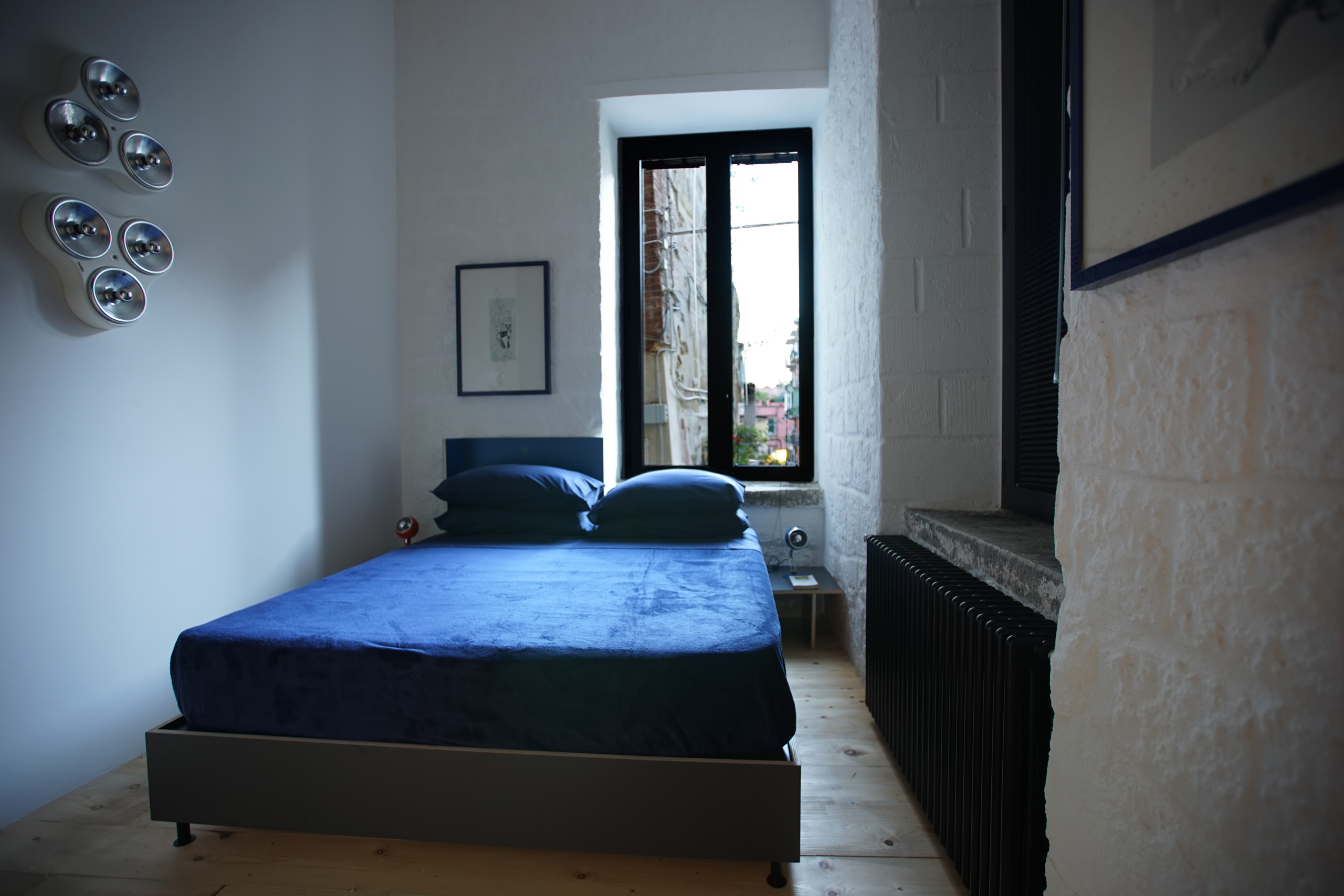La seconde chambre comporte deux fenêtres aux huisseries peintes en noir. Son aménagement minimaliste est agrémenté d’une applique et d’un chevet vintage chromés qui jouent avec la lumière.