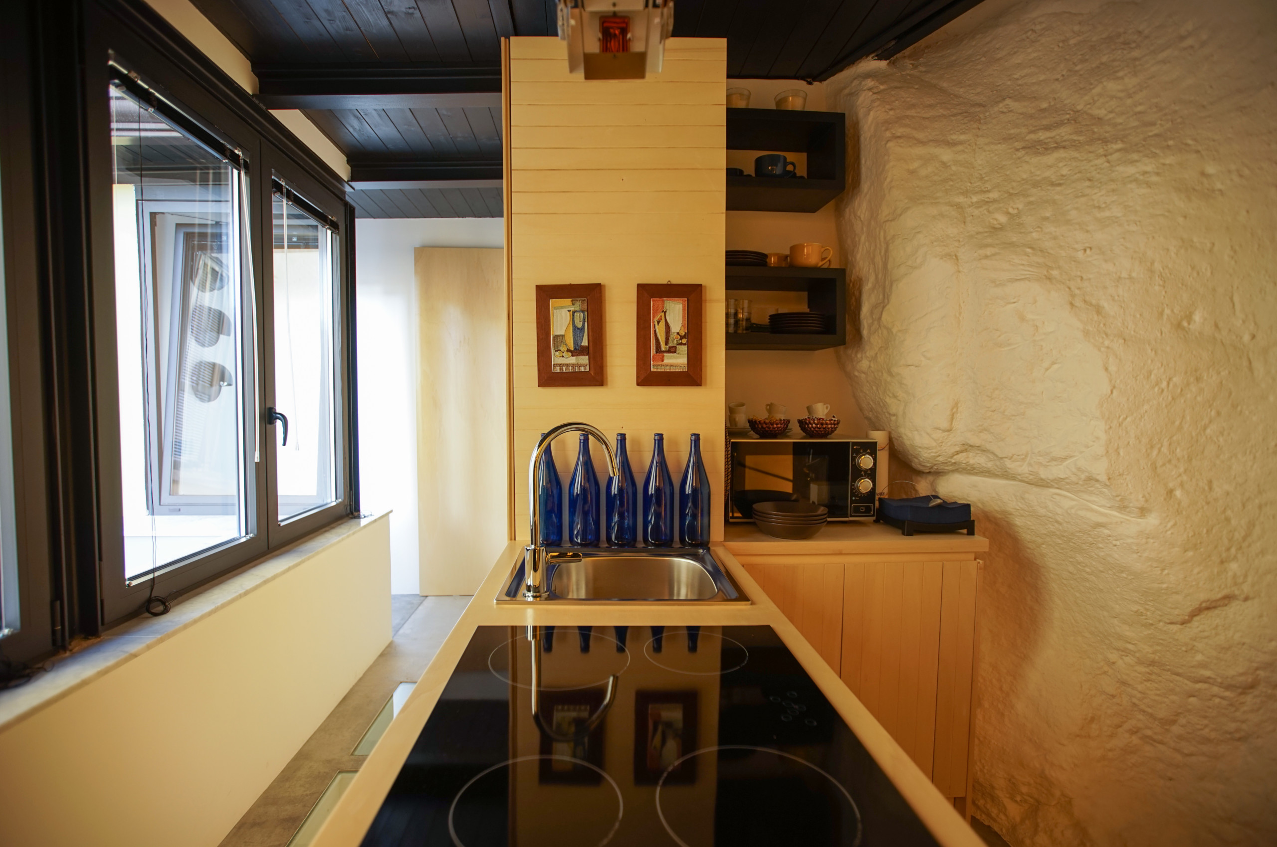 La cuisine est installée dans le passage menant au bureau. Malgré sa petite taille, elle reste fonctionnelle et surtout, elle révèle le flanc de la montagne !
