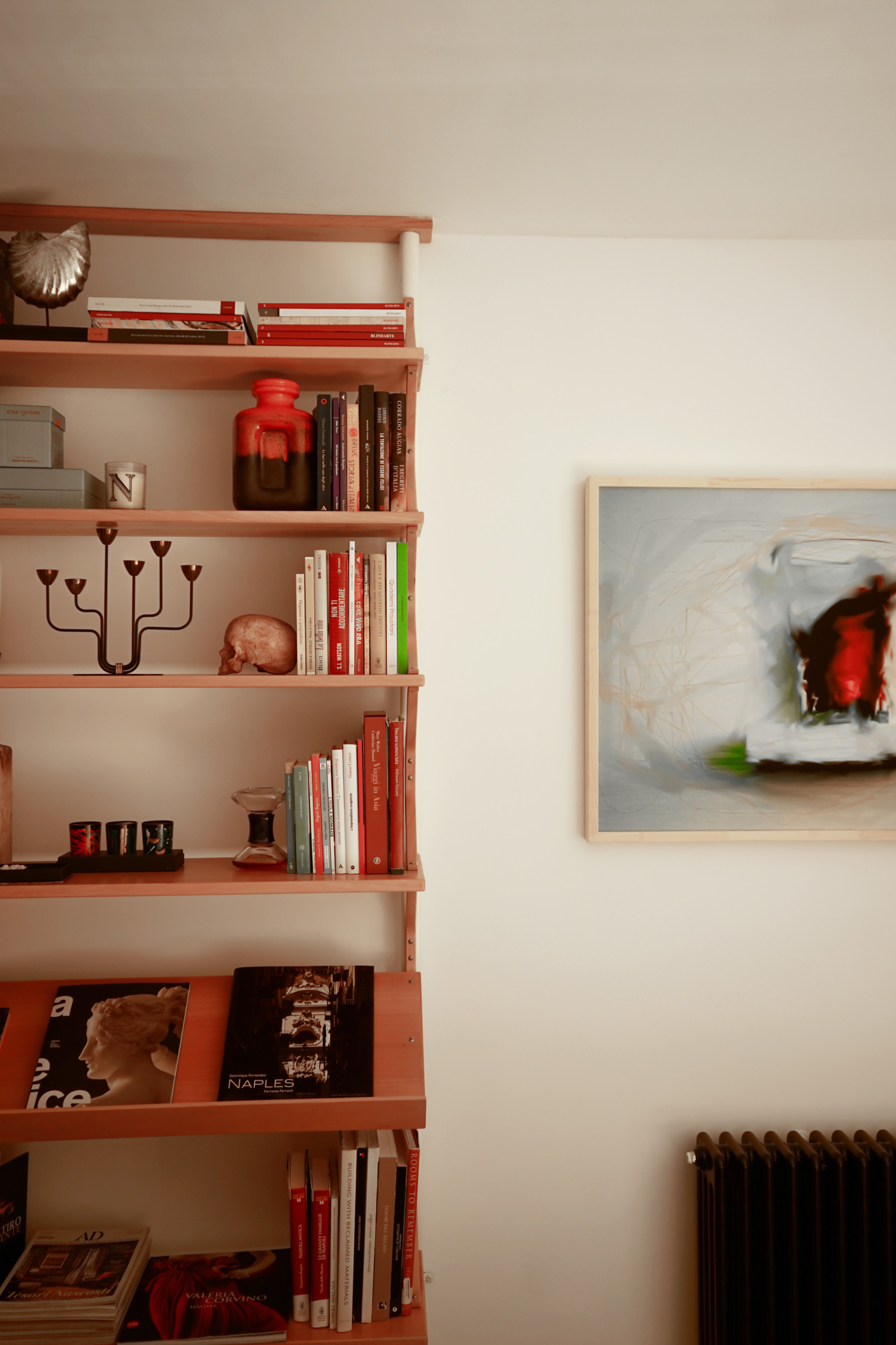 Bibliothèque Bois Cuisine ouverte Mur coloré Pierre Plantes