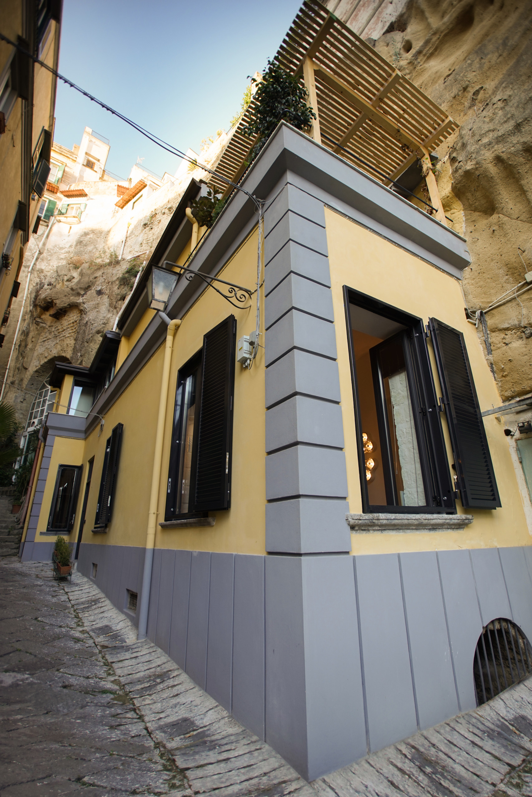 Avant d’entamer la visite, on jette un oeil à la façade toute en longueur de cette petite maison de ville. Elle est adossée à la roche, sur les hauteurs du quartier huppé de Chiaia.