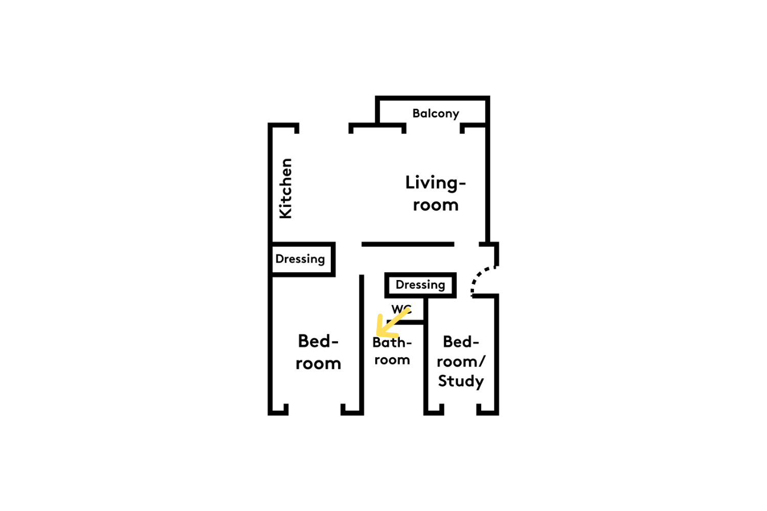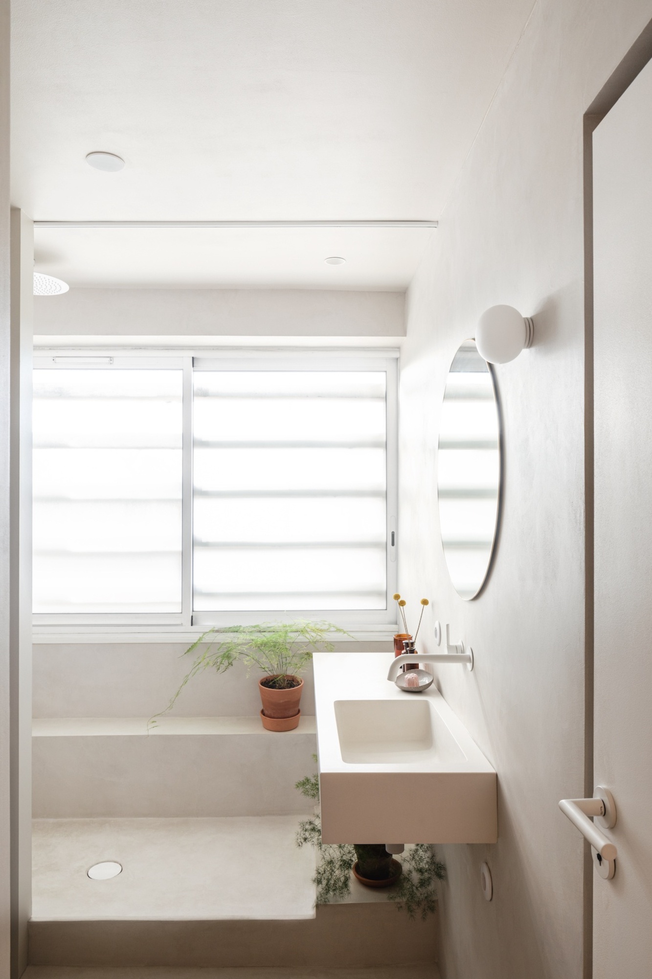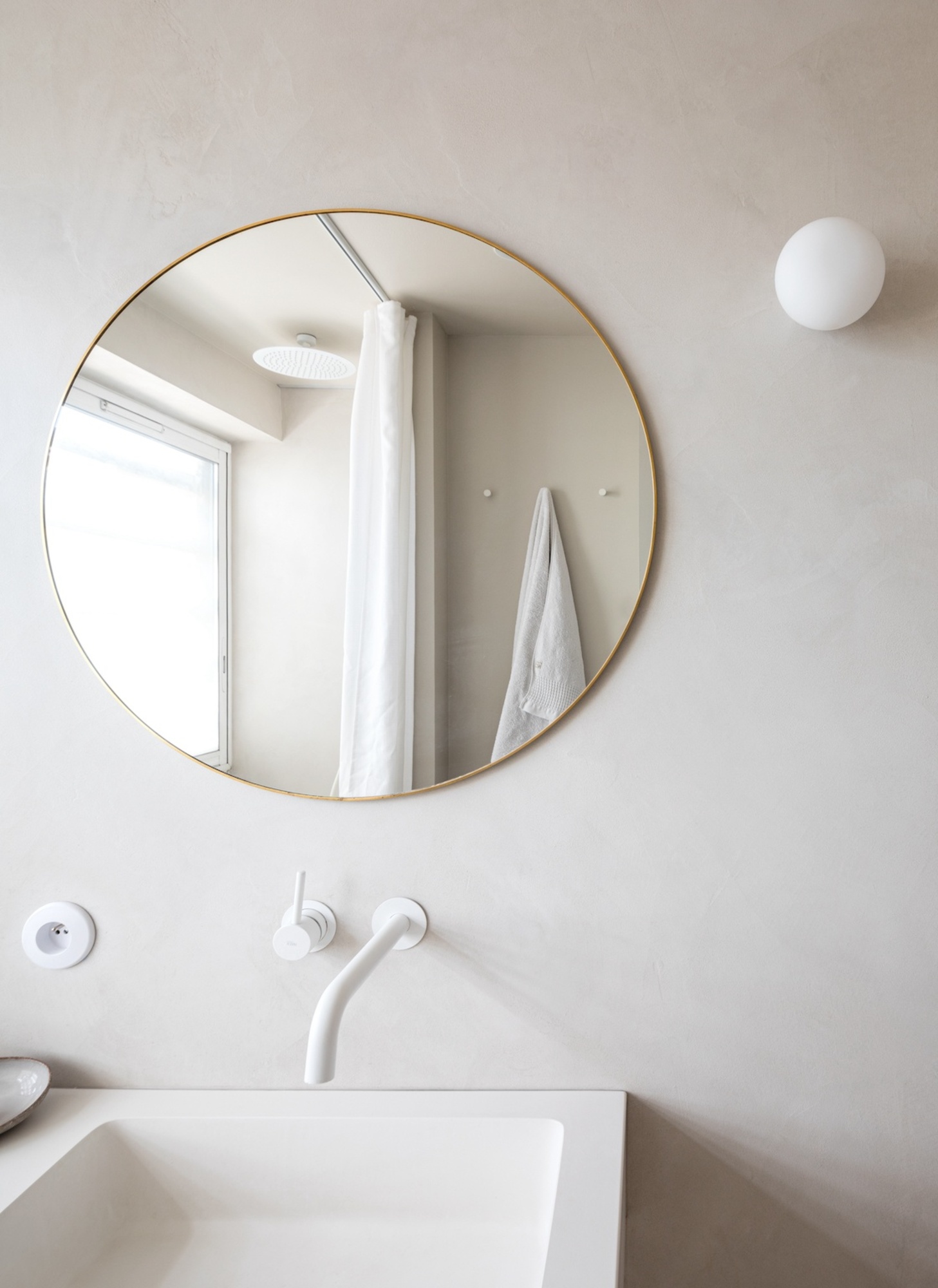 L’une des portes mène à la salle de bain, entièrement réalisée en béton ciré.