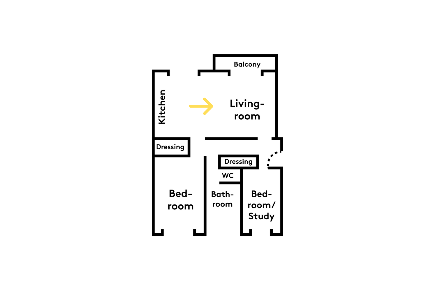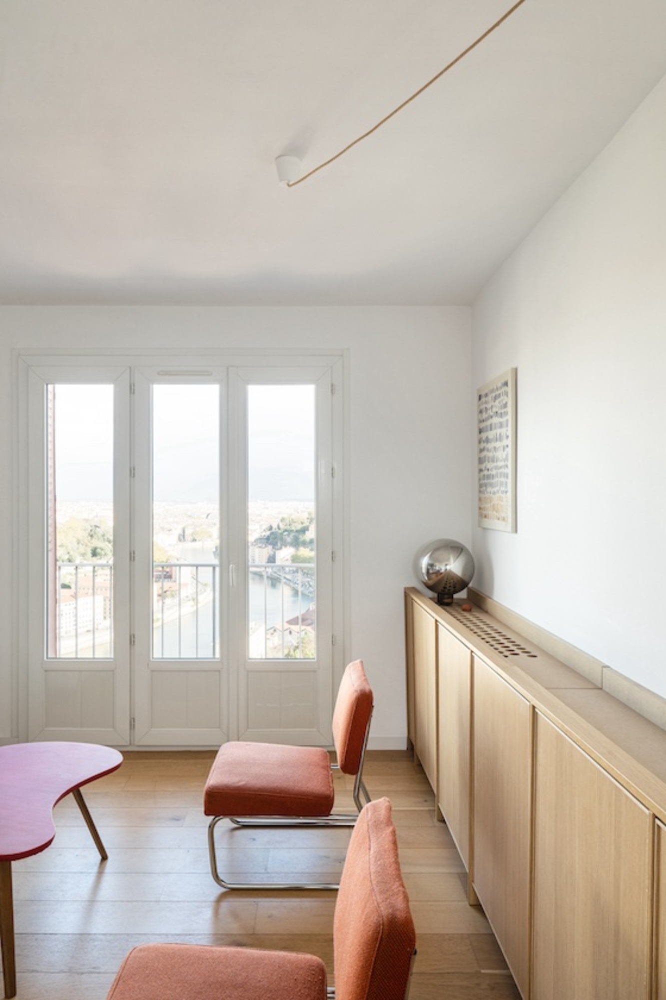 Dès le séjour, une vue surplombant le centre-ville lyonnais et la Saône est mise à l’honneur par un aménagement épuré et discret.