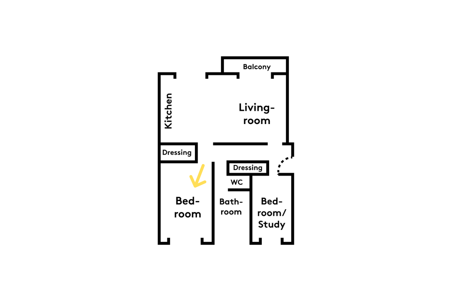 Dans la chambre principale, des éléments rappellent l’espace de vie. Le meuble bas en chêne, ravivé par des tonalités vertes …