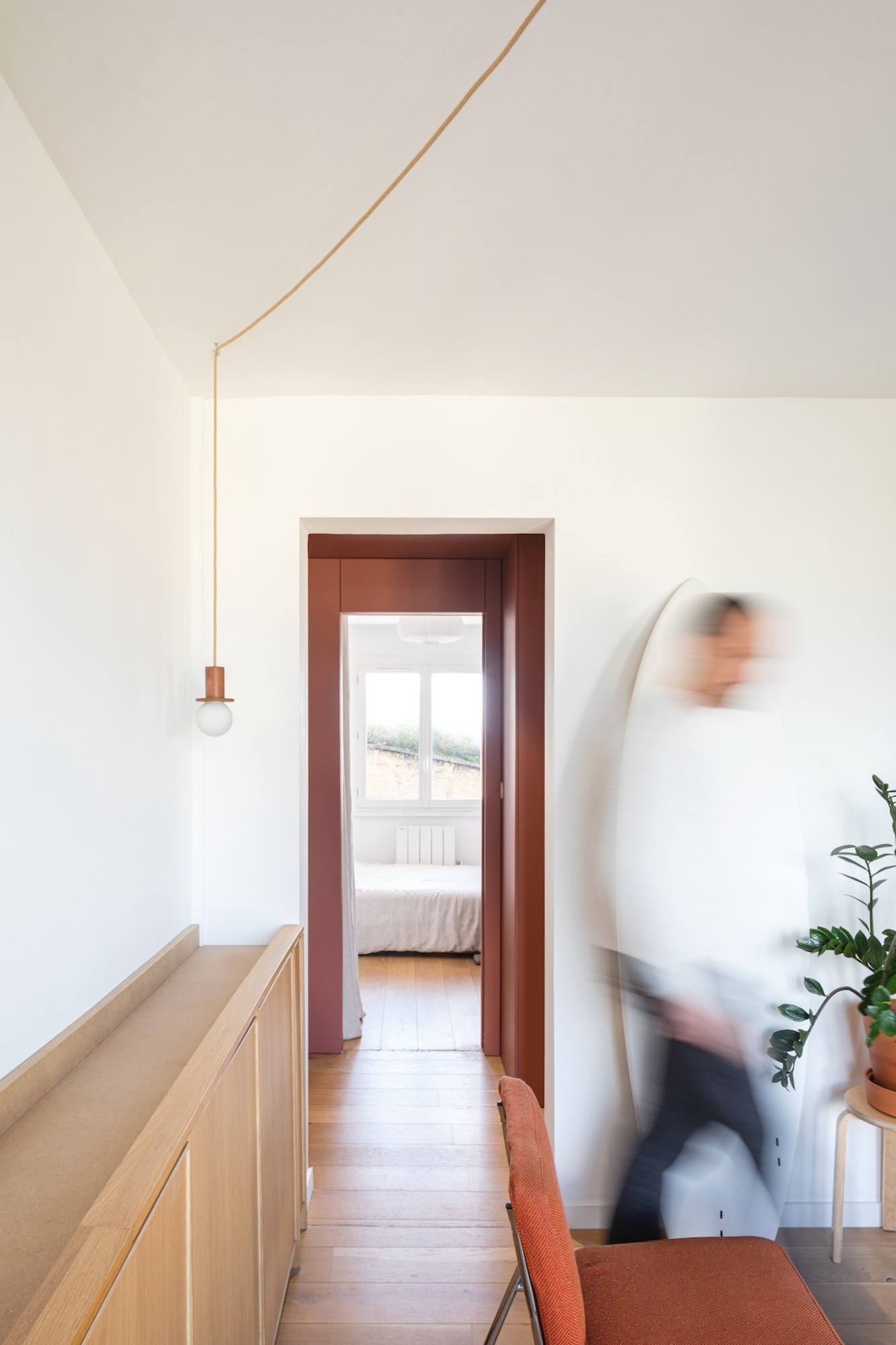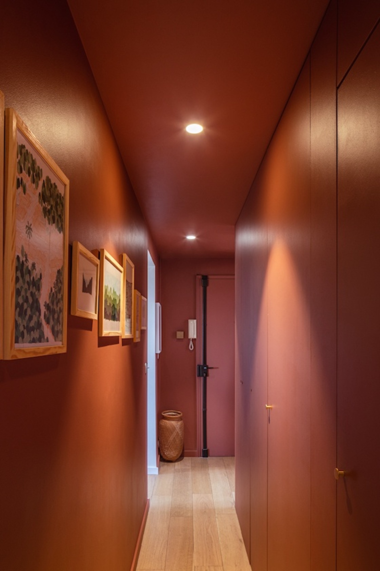 Le couloir qui dessert les différents espaces est peint d’un rouge terracotta et fond les rangements parmi les portes menant aux pièces.