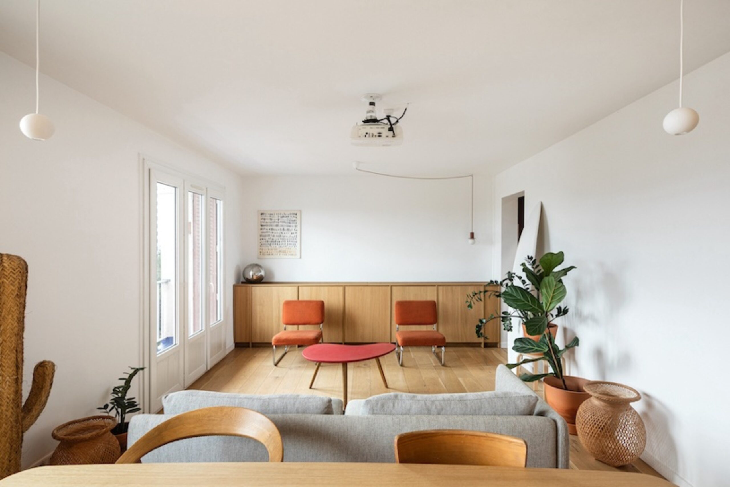 Le bois y est central avec notamment ce meuble en enfilade qui dissimule un radiateur et une bibliothèque, et qui fait écho …