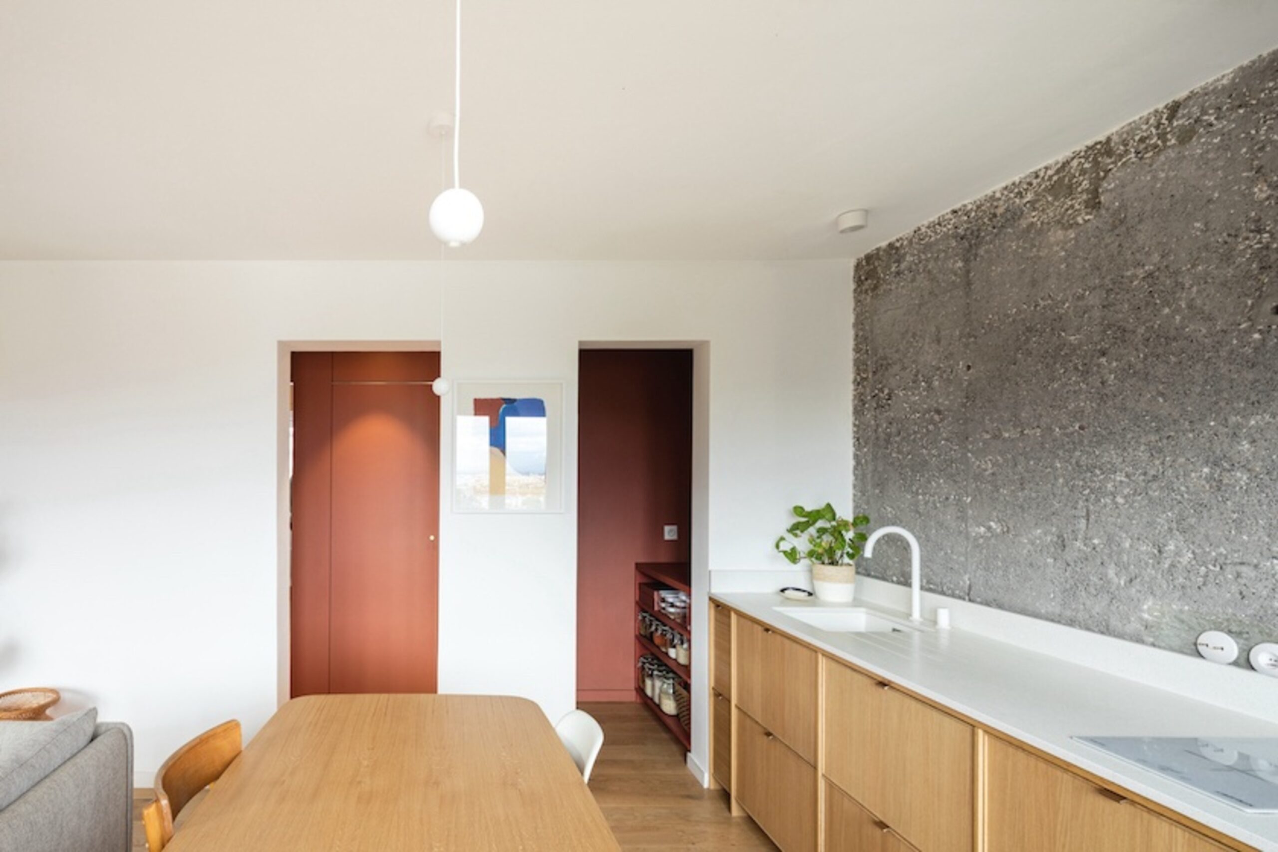 Sobre, la cuisine se compose de portes en chêne et d’un plan de travail en poudre de quartz, dont seul le mitigeur et l’évier restent visibles.
