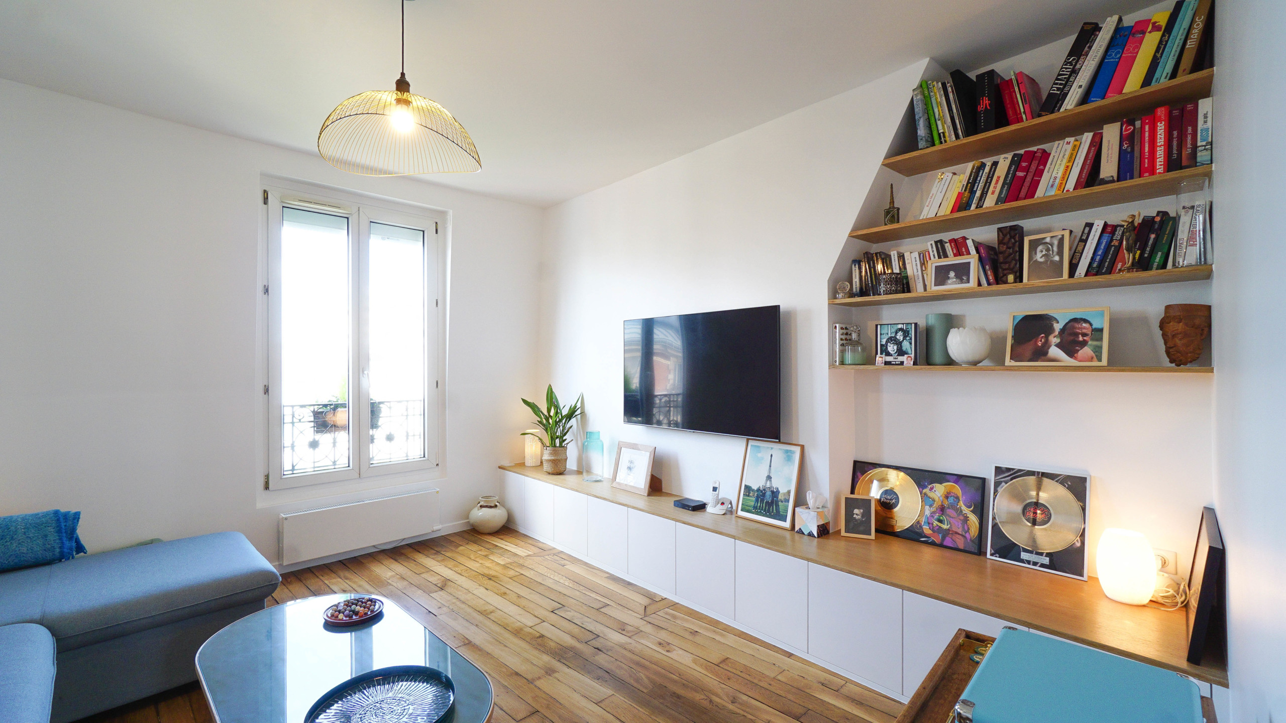 On remarque le meuble bas comme un buffet qui peut aussi servir d’assise supplémentaire. Dans le renfoncement des conduits de cheminée, on a logé des étagères pour pouvoir disposer livres et bibelots…
