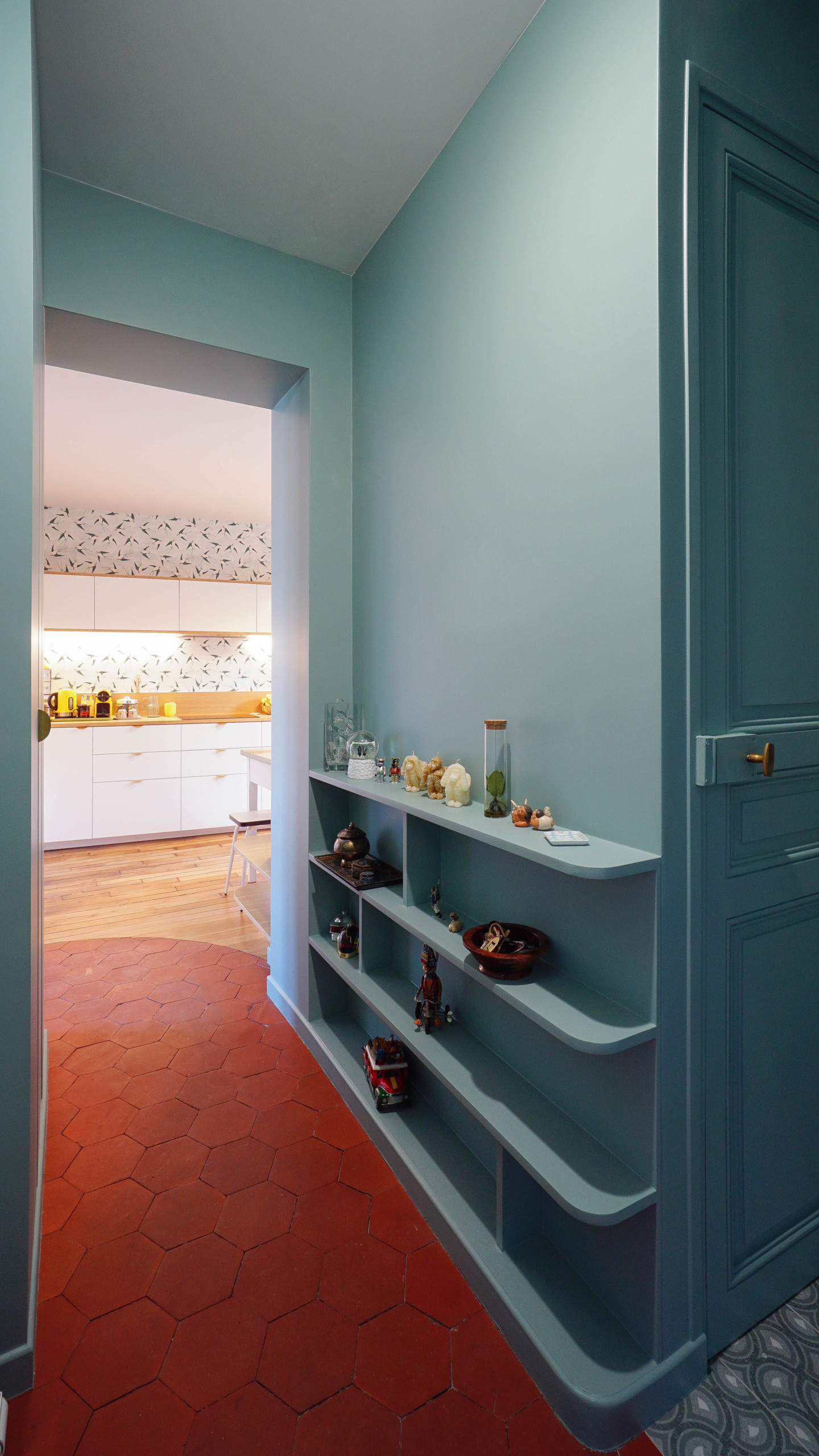 Dans l’entrée, l’architecte a créé des étagères sur mesure. Peintes elles-aussi en vert d’eau, elles se fondent dans la longueur du mur. Elles permettent de décorer l’espace et de vider ses poches !