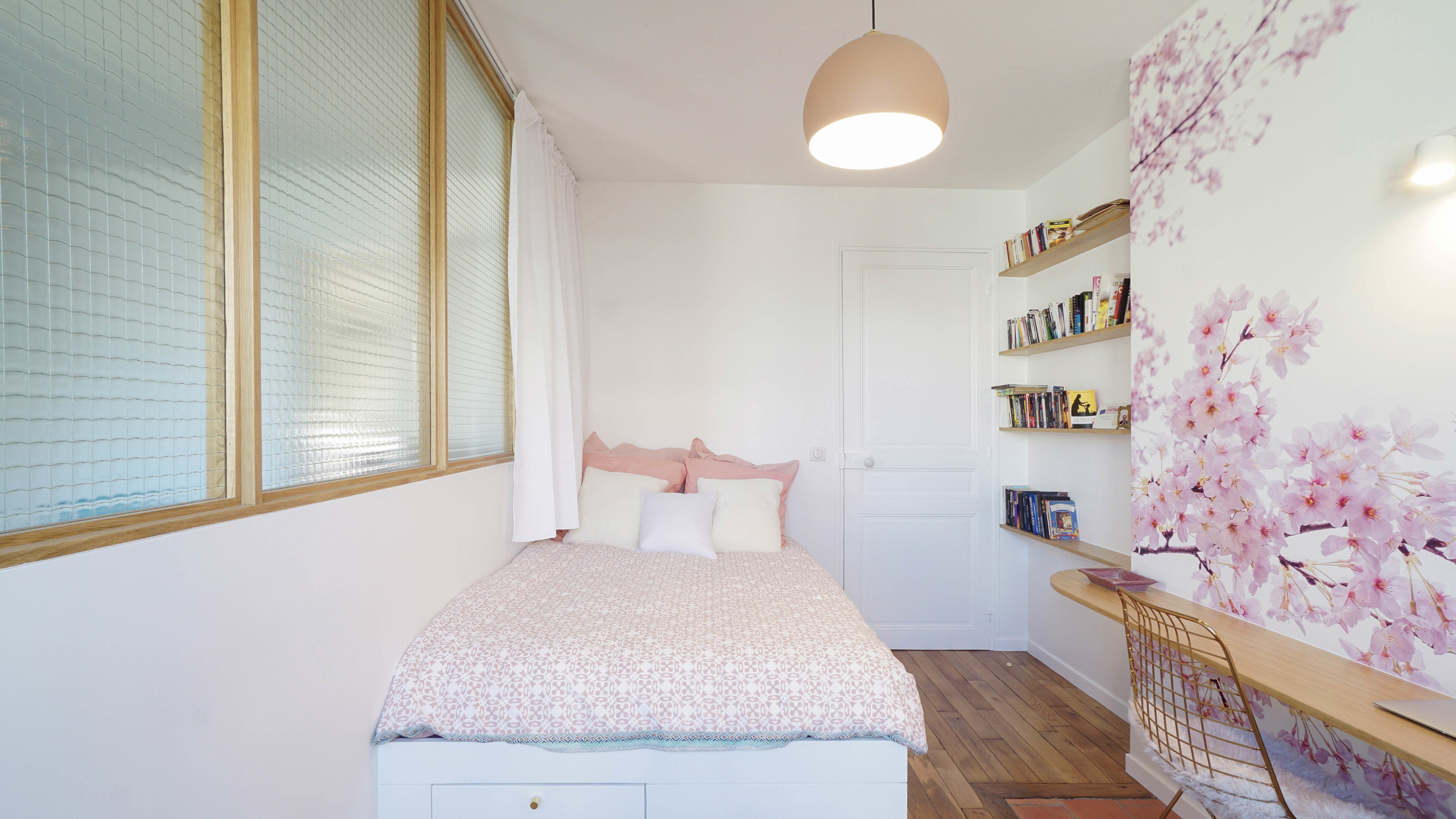 Le papier peint vient de chez Photowall. La propriétaire serait-elle grande admiratrice des cerisiers japonais ? Ou du printemps ? Ça tombe bien, le printemps, c’est maintenant !
