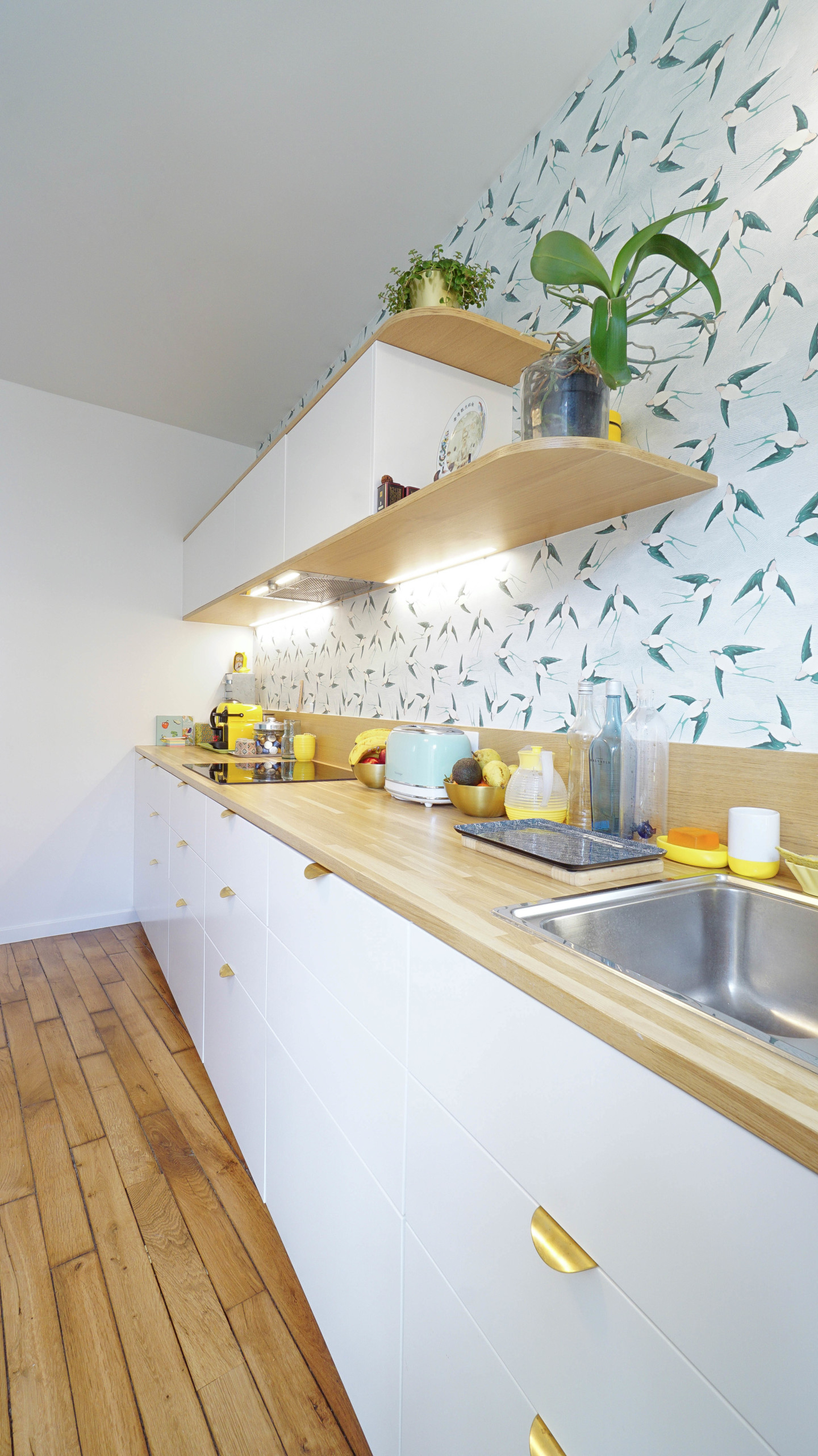 Et maintenant la cuisine. Celle-ci a été agencée en longueur. Avec son large plan de travail et ses modules de rangements bas et hauts, elle est très fonctionnelle.