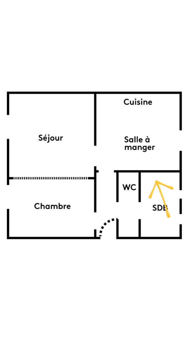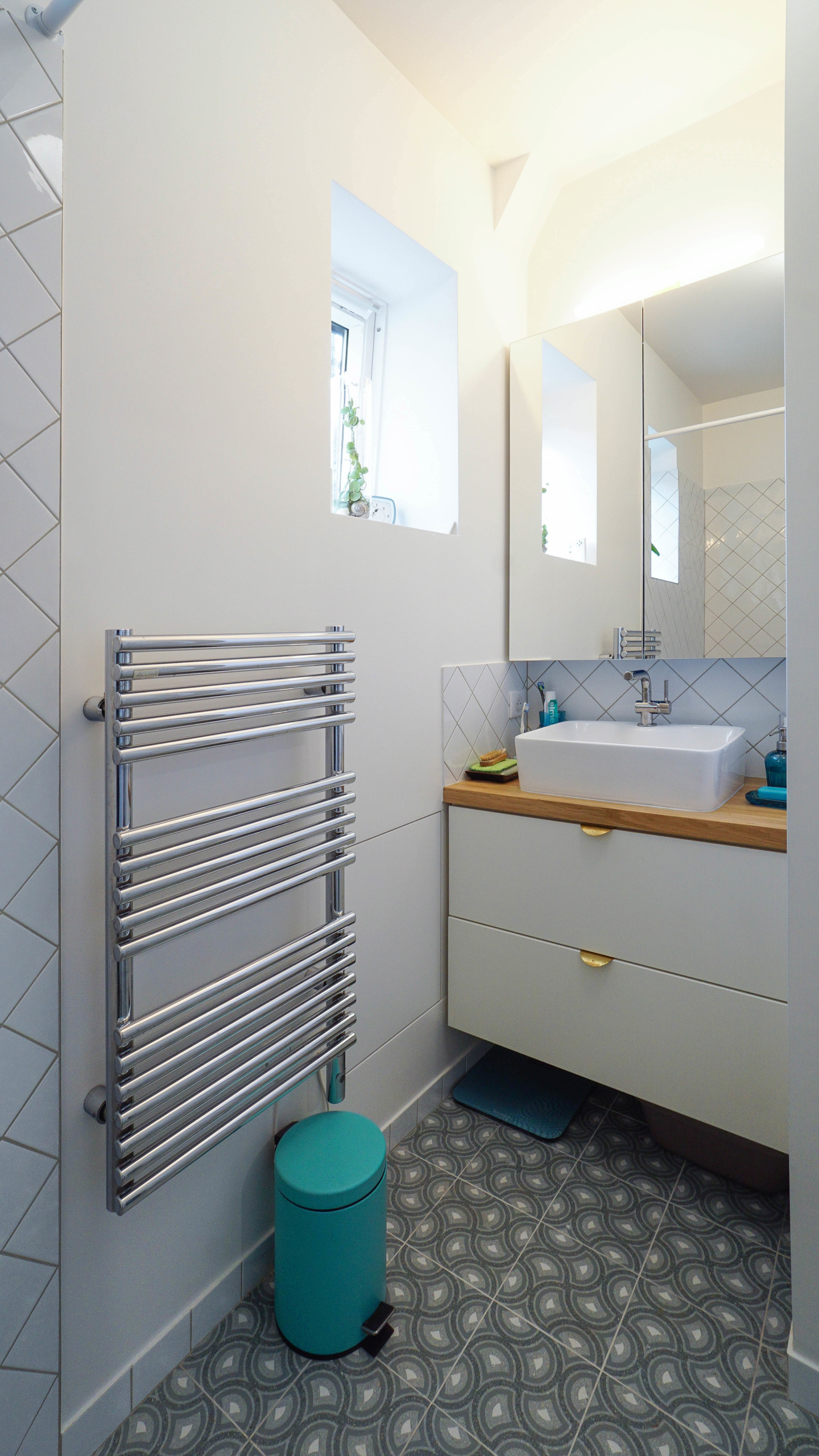 Et voici la salle de bains. Au sol, on retrouve les mêmes carreaux à motifs que dans les toilettes et une partie de l’entrée.