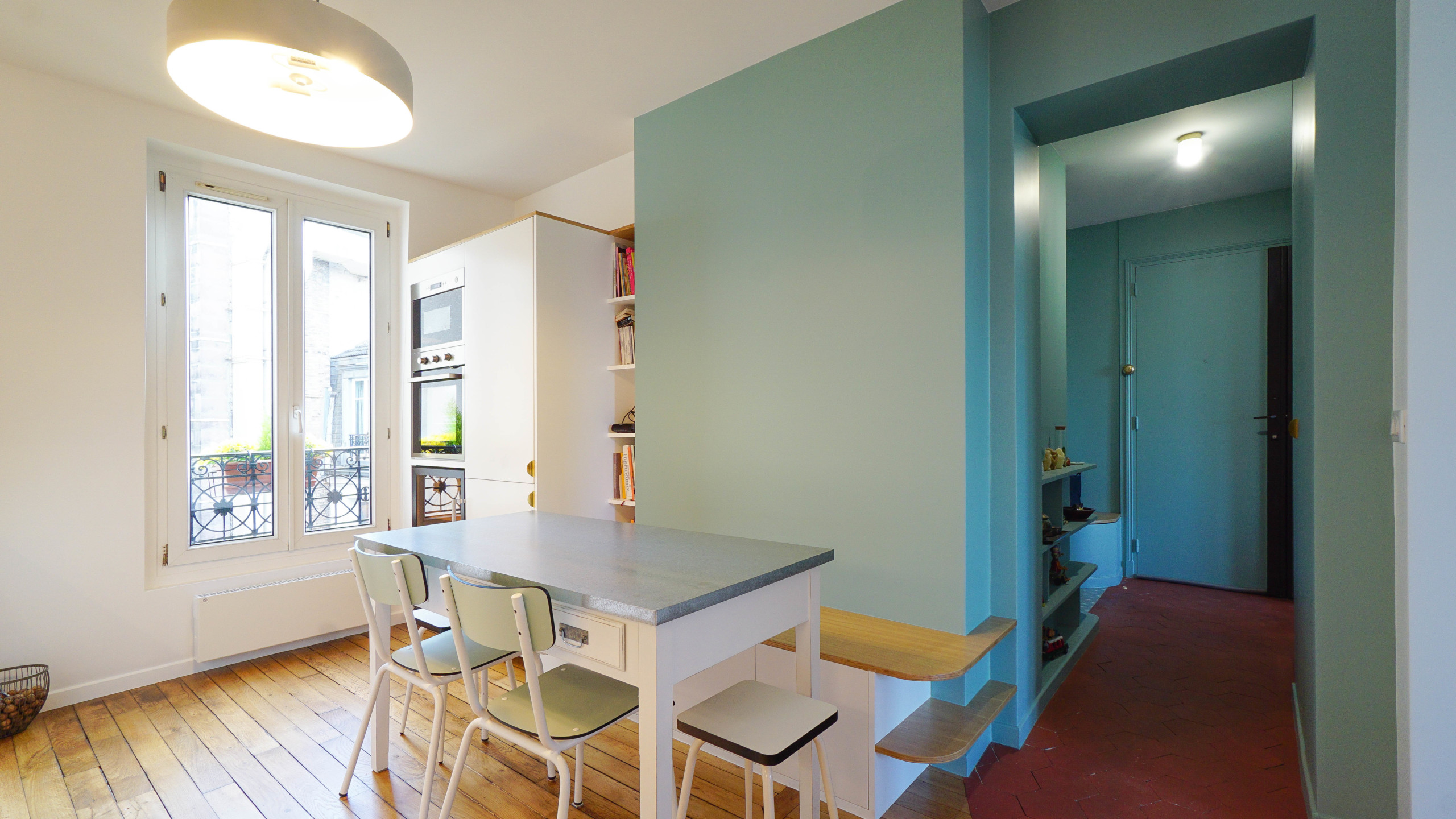 Les étagères de l’entrée semblent s’être changées en banc. Pour une impression de cohérence et de fluidité renforcée. Les meubles avec la table en zinc Les Gambettes apportent une touche industrielle bienvenue. Et toujours un rappel de couleur du couloir d’entrée.