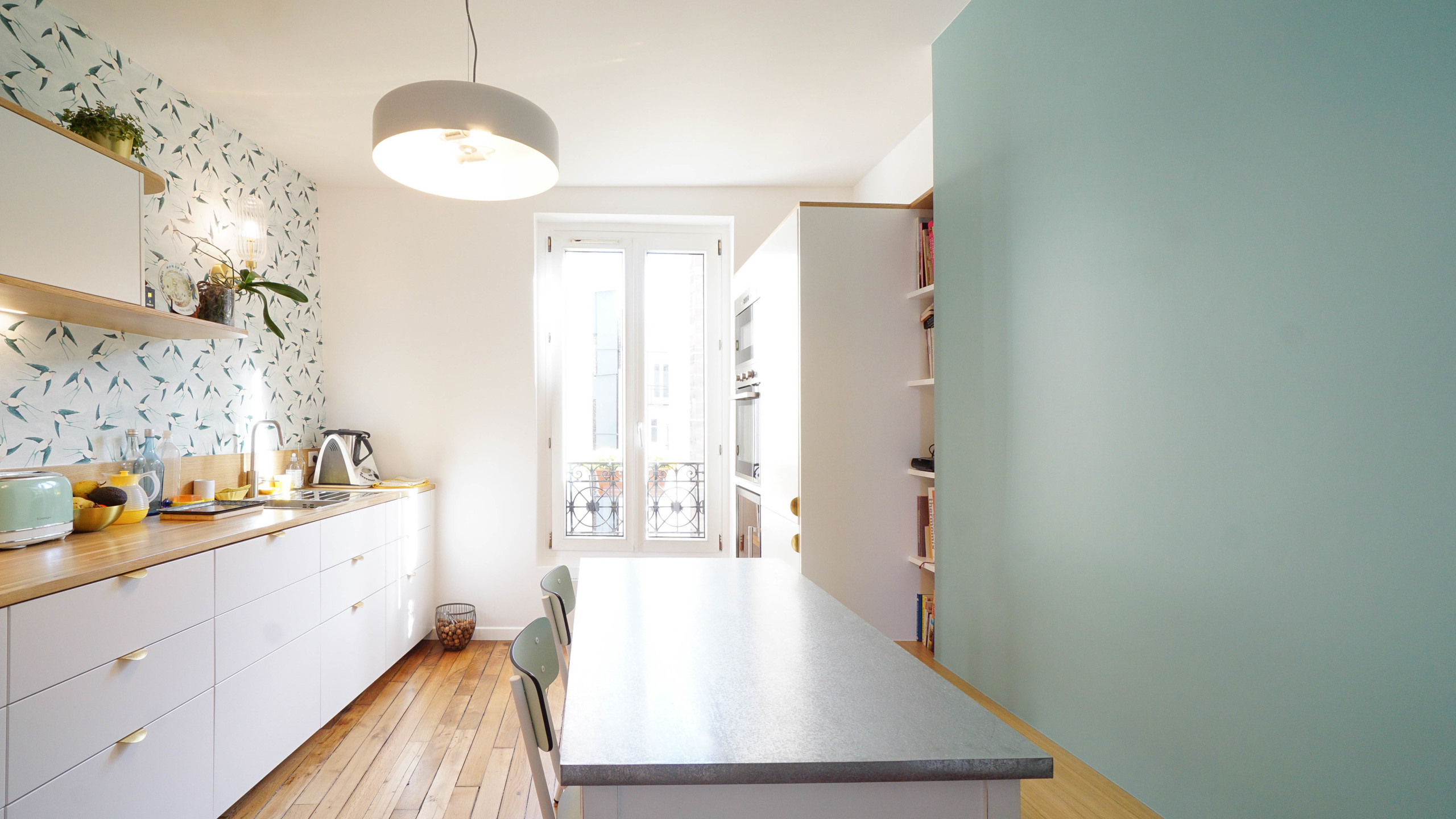 Bibliothèque Bois Carrelage Cuisine ouverte Dressing Mur coloré Papier peint Tomette Verre listral Verrière