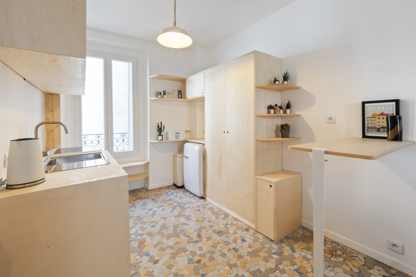 Le studio bénéficie d’une belle cuisine sur mesure en contreplaqué bouleau intégrant de nombreux rangements, dont une armoire dressing. Un sol en cassons d’origine délimite la pièce et dynamise l’ensemble.