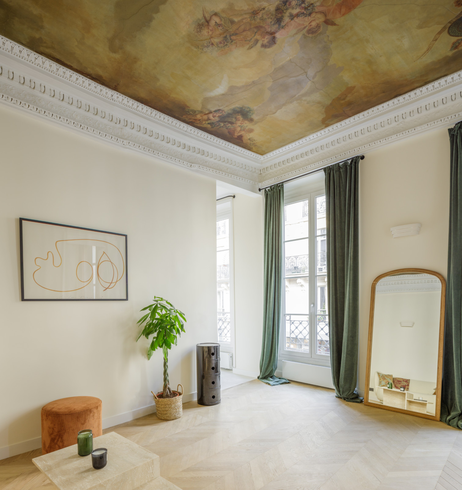 On admire la taille et le travail des moulures, également conservées. Elles sont mises en valeur par leur teinte blanche qui magnifie le plafond, comme un cadre autour d’une œuvre d’art.